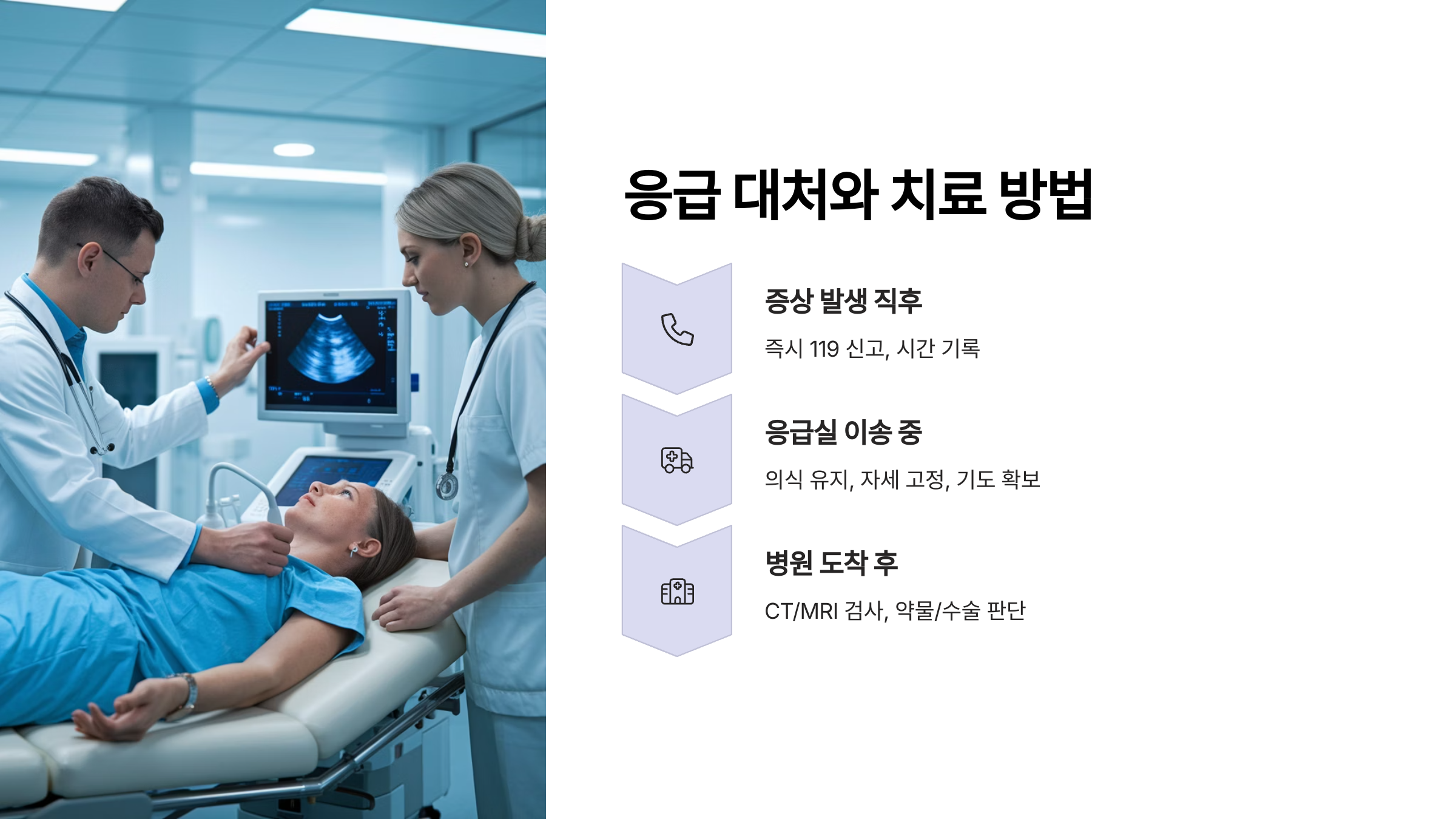 | 병원 도착 후 | CT/MRI → 약물치료 또는 수술 여부 판단 |