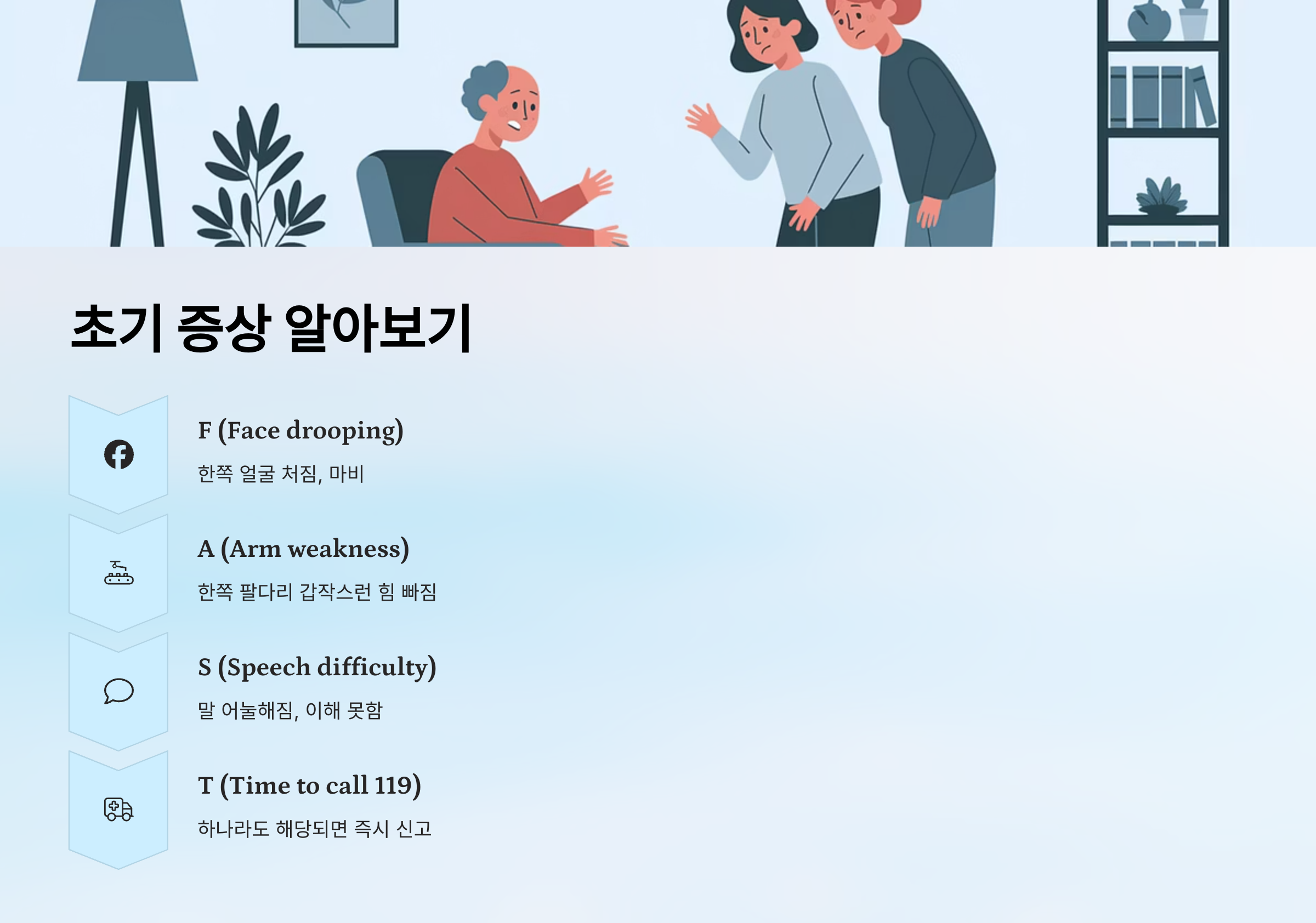 | F (Face drooping) | 한쪽 얼굴이 쳐지거나 마비됨 |