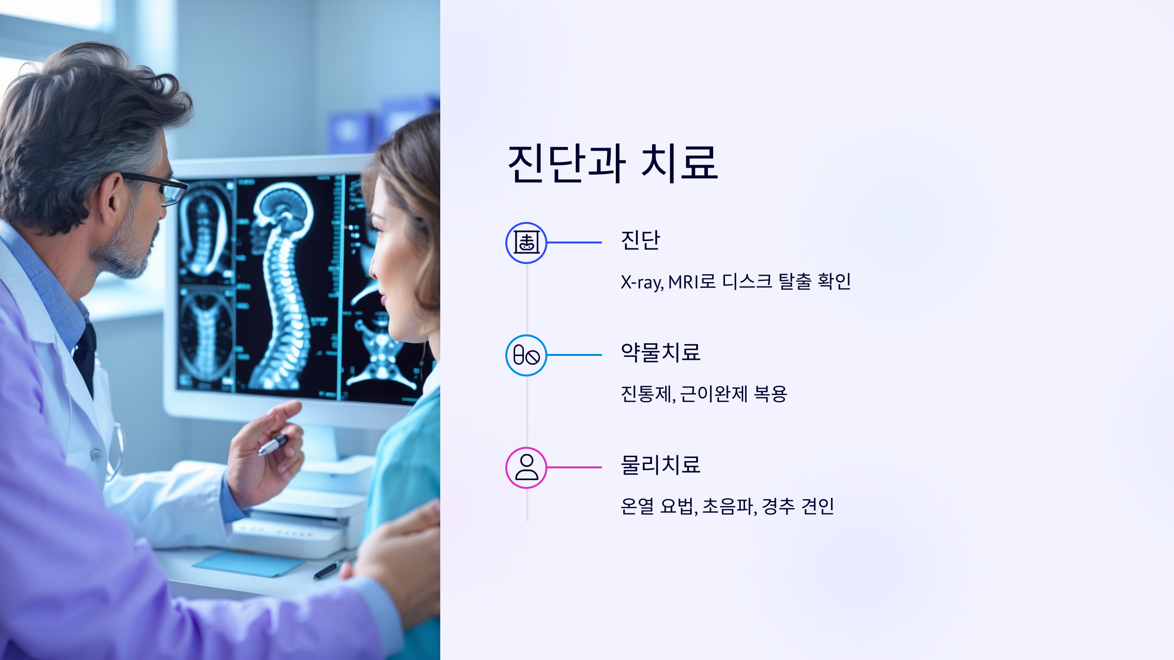 병원에서는 X-ray, MRI를 통해 디스크 탈출 정도와 신경 압박 유무를 확인해요.