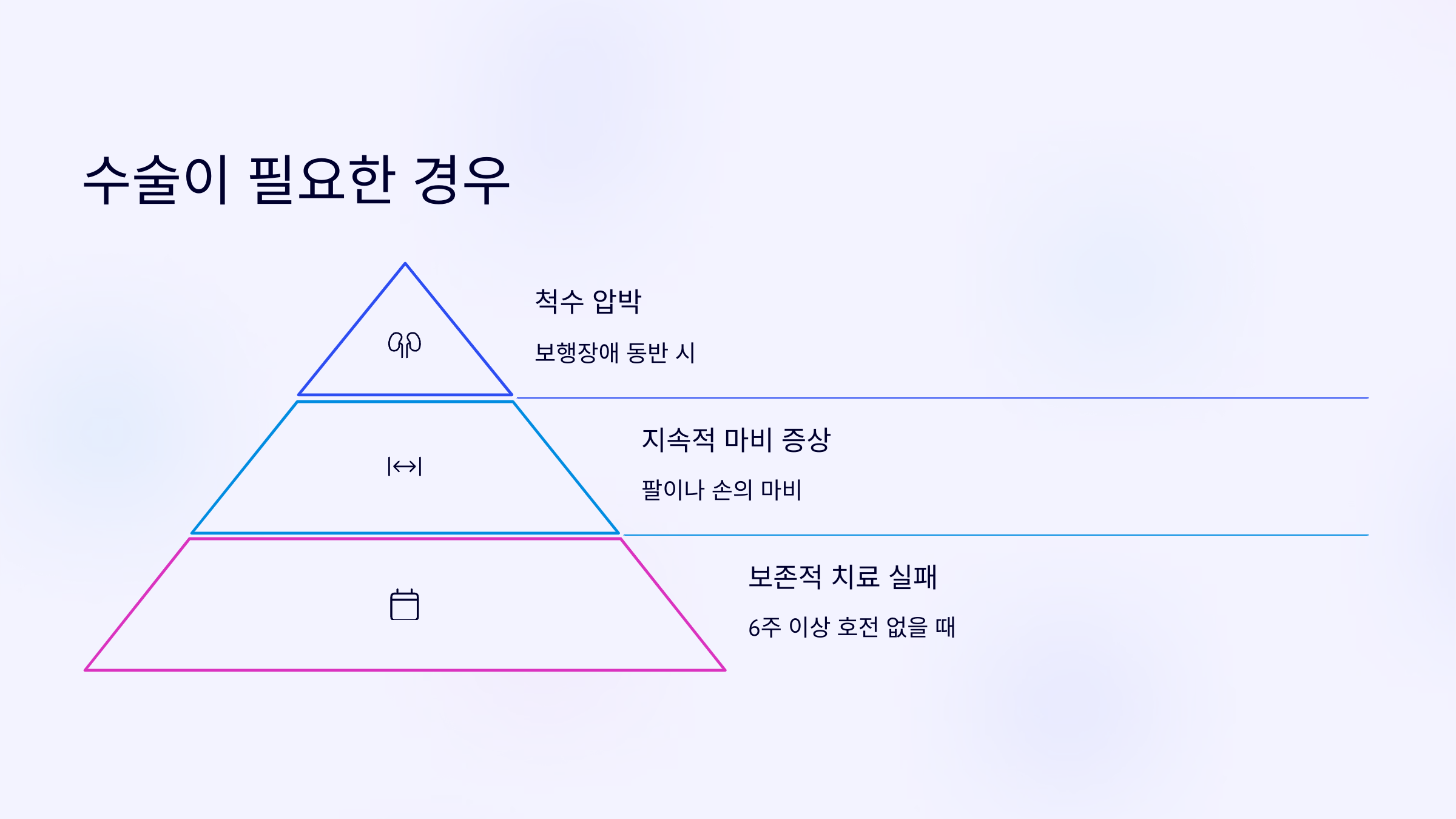 • 6주 이상 보존적 치료에도 증상 호전이 없을 때
