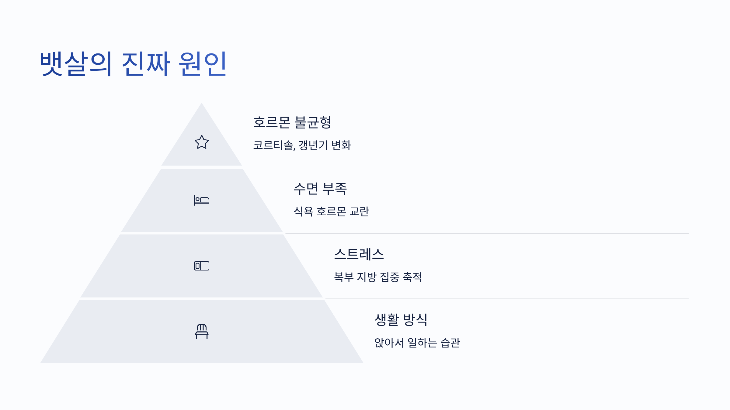 수면 부족, 스트레스, 호르몬 불균형, 유전적 체형,