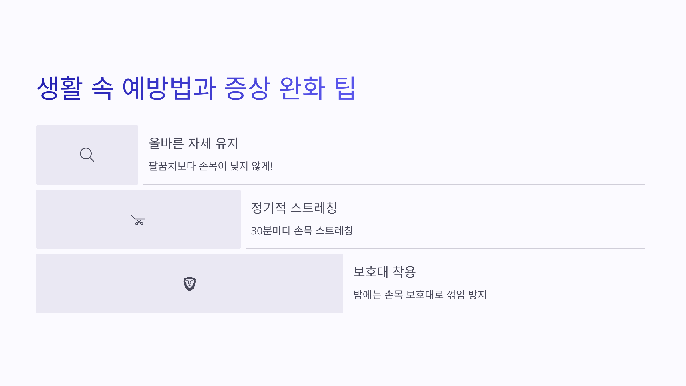 | 밤에는 손목 보호대 착용 | 자는 동안 손목 꺾임 방지 |