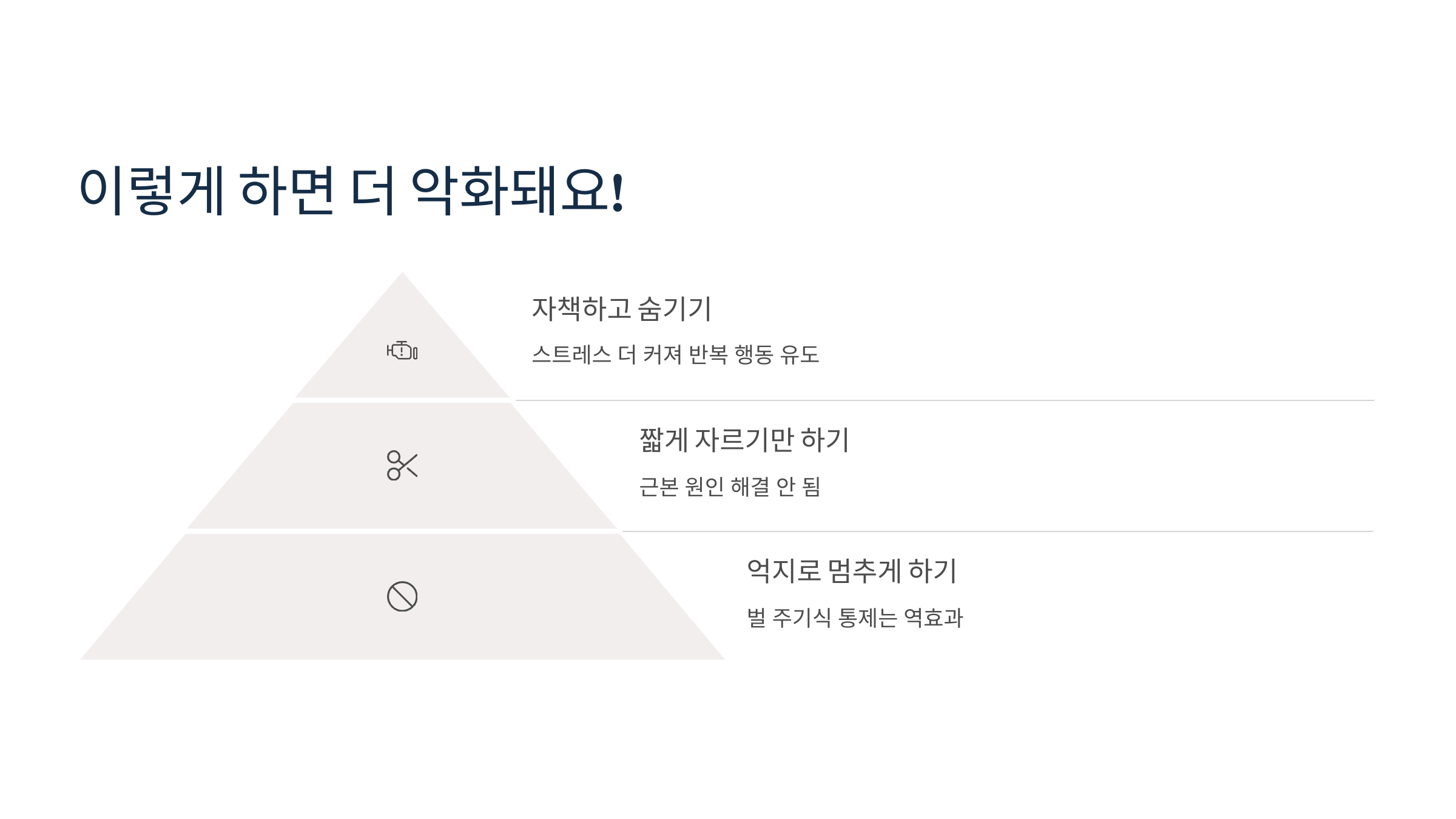 - 자책하고 숨기려 하기 → 스트레스 더 커져 반복 행동 유도