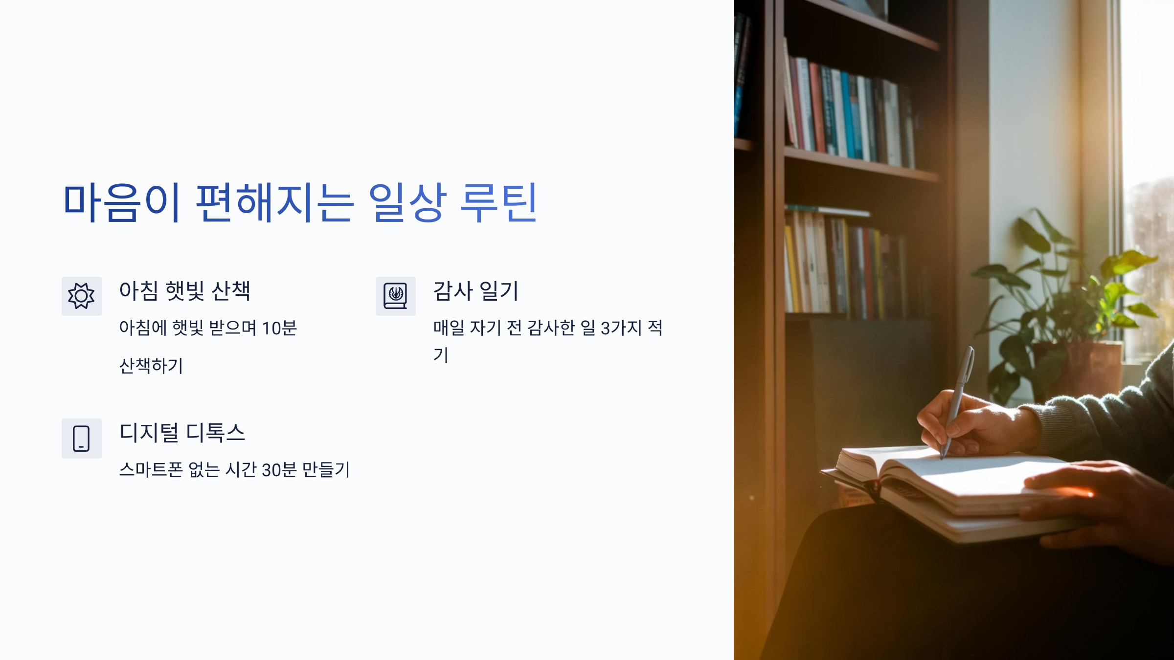 스트레스를 줄이기 위해 꼭 요가를 하거나 명상을 배울 필요는 없어요. 일상 속 루틴 몇 가지만 바꿔도 효과는 꽤 크거든요.