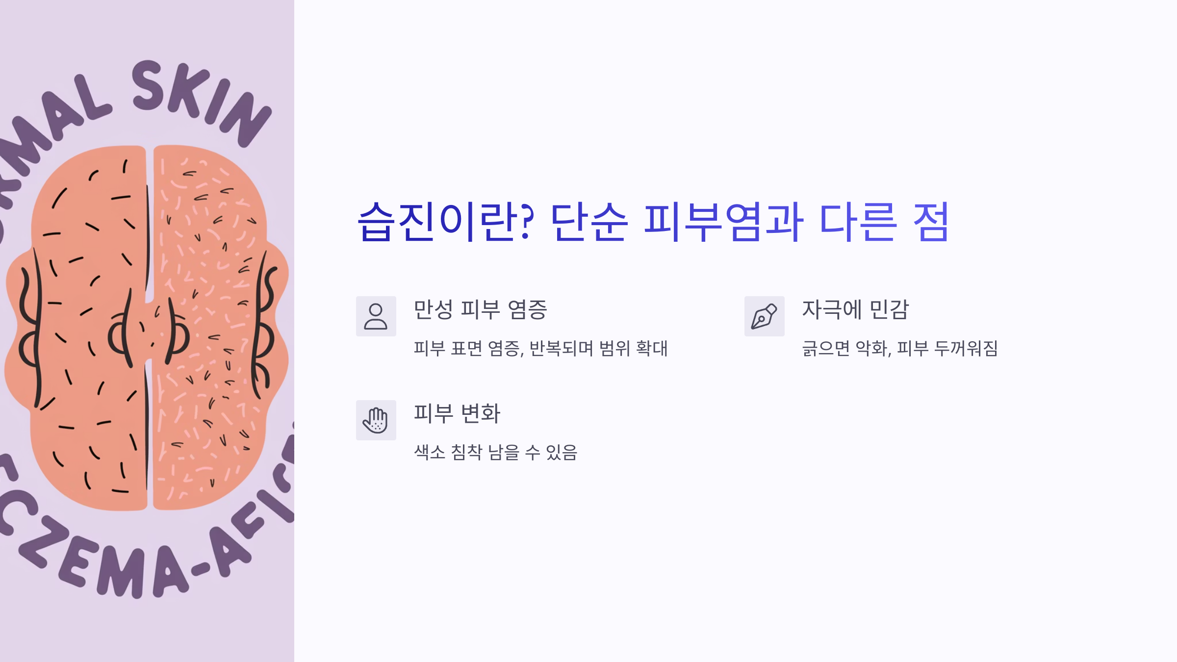 | 아토피성 습진 | 유전적 요인과 면역 불균형으로 생기며, 반복 재발 |