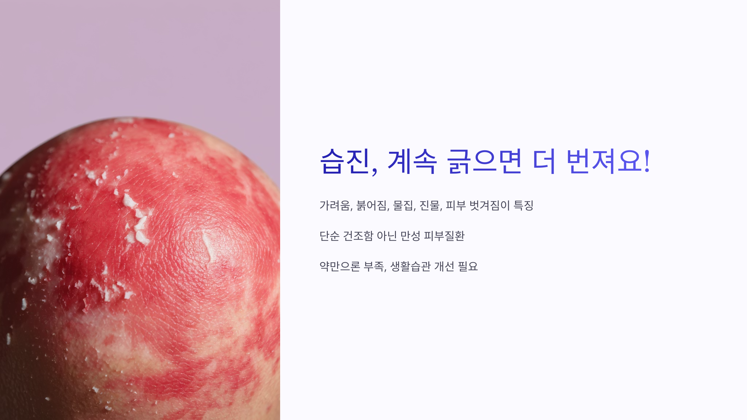 단순한 피부 건조와는 다르게 반복되며 점점 범위가 넓어지고, 자극에 민감해집니다.