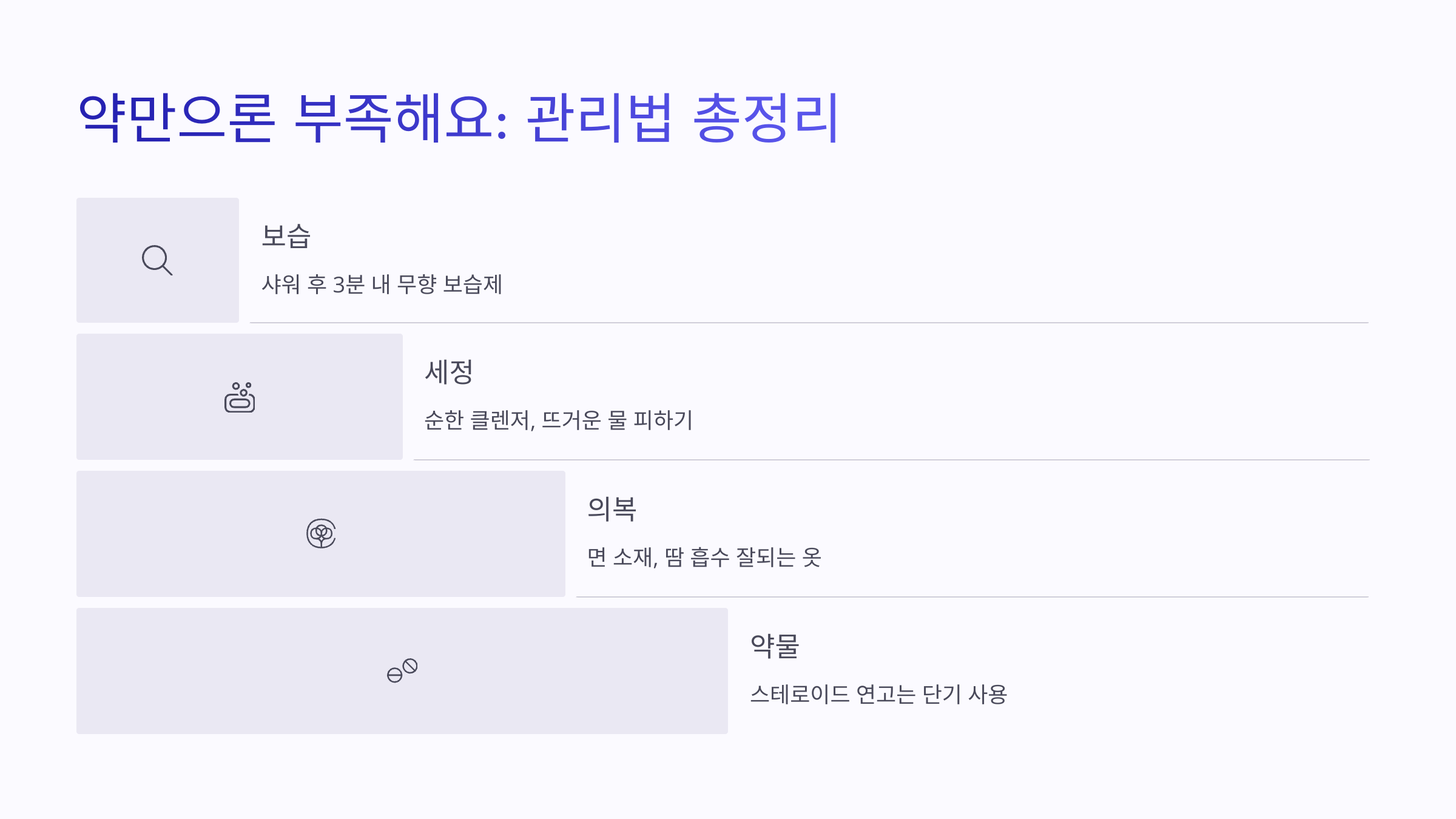 | 보습 | 샤워 후 3분 내에 무향 보습제 듬뿍 바르기 |