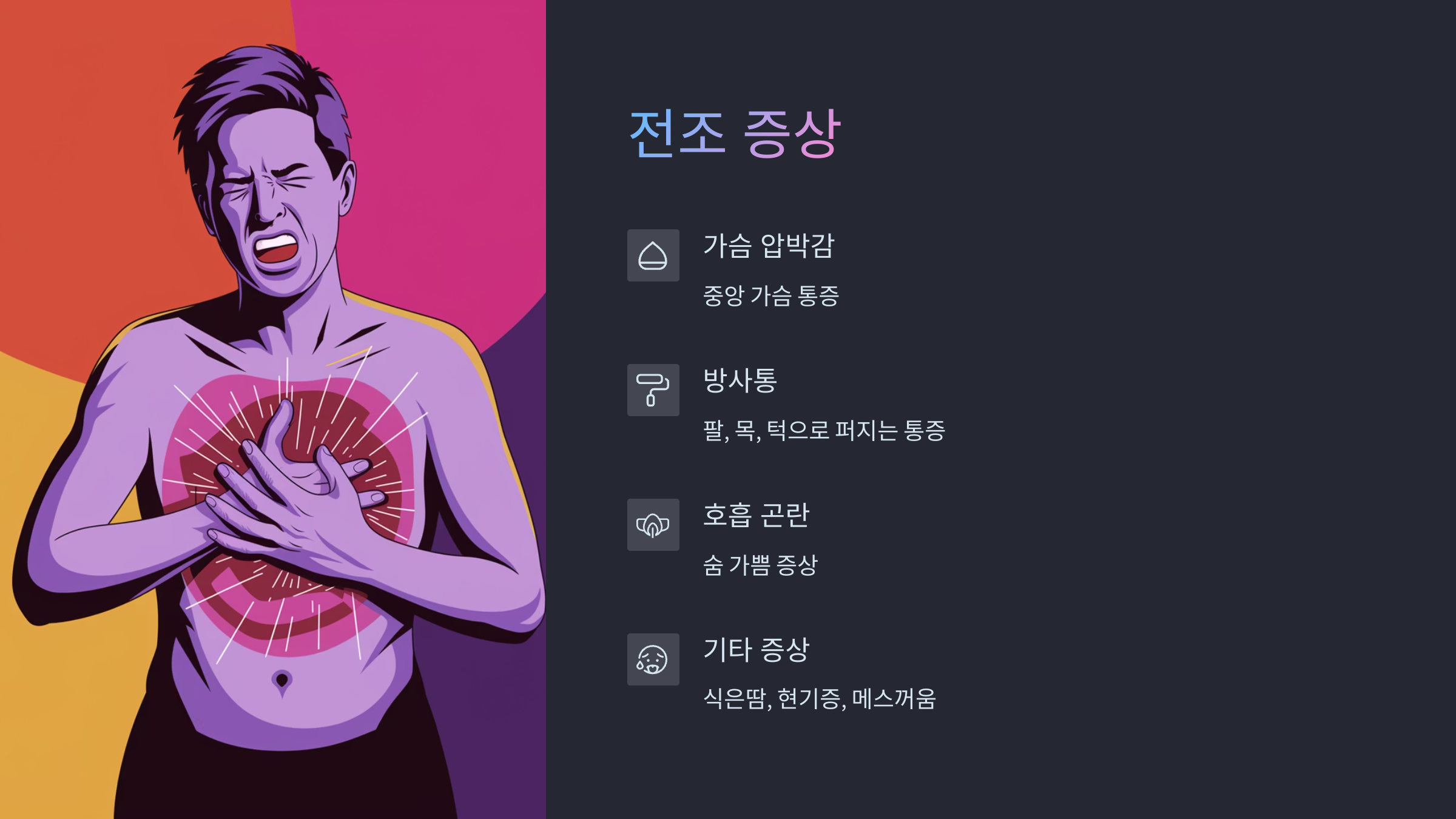 - 팔, 목, 턱, 등으로 퍼지는 통증
