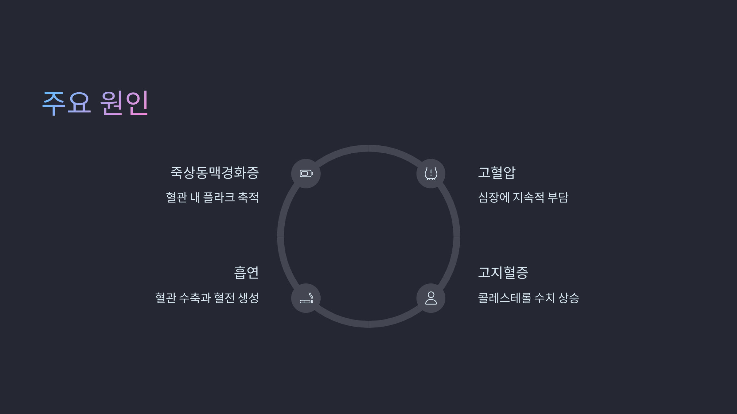 | 죽상동맥경화증 | 혈관 안에 플라크가 쌓여 혈류를 막음 |