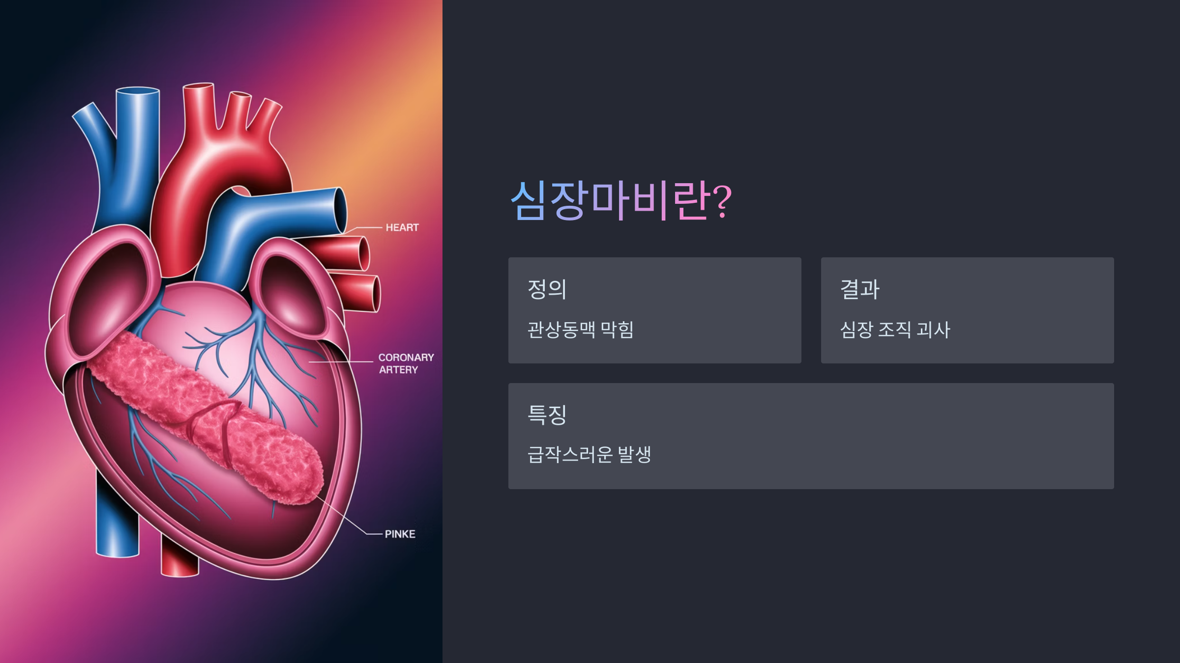 간단히 말하면, 심장이 혈액을 제대로 공급받지 못해 기능을 멈추는 거죠.