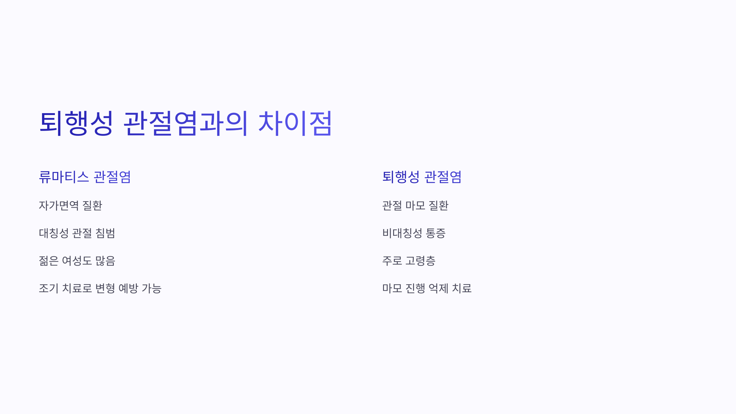 - 퇴행성: 관절 마모, 비대칭성 통증, 주로 고령층
