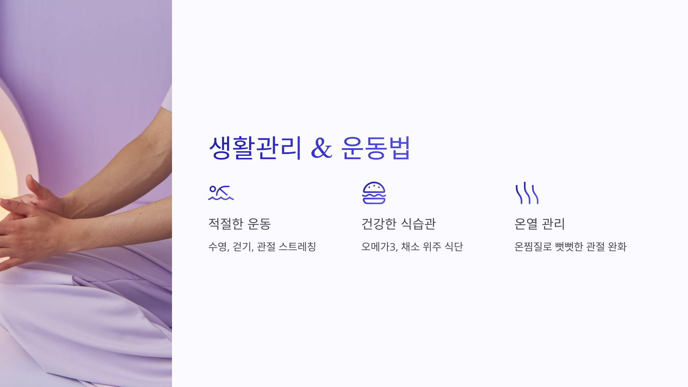 | 온열 관리 | 온찜질로 뻣뻣한 관절 완화 |