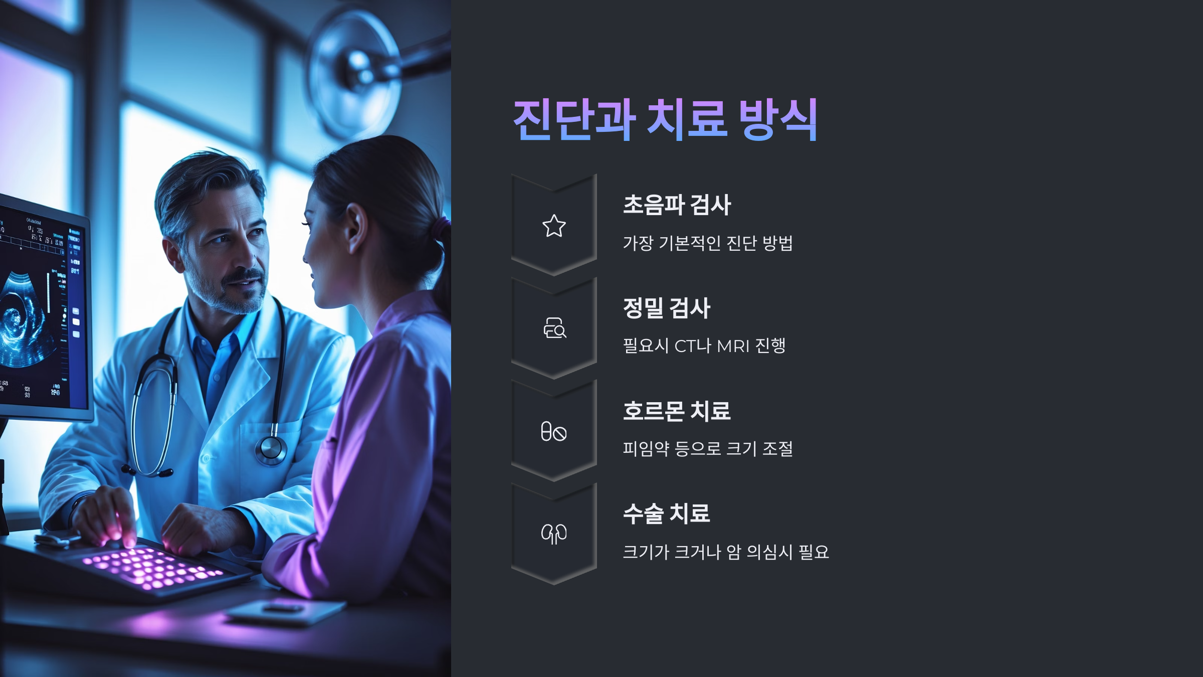 하지만 크기가 크거나, 파열 위험이 있거나, 암성 여부가 의심될 땐 수술이 필요해요.