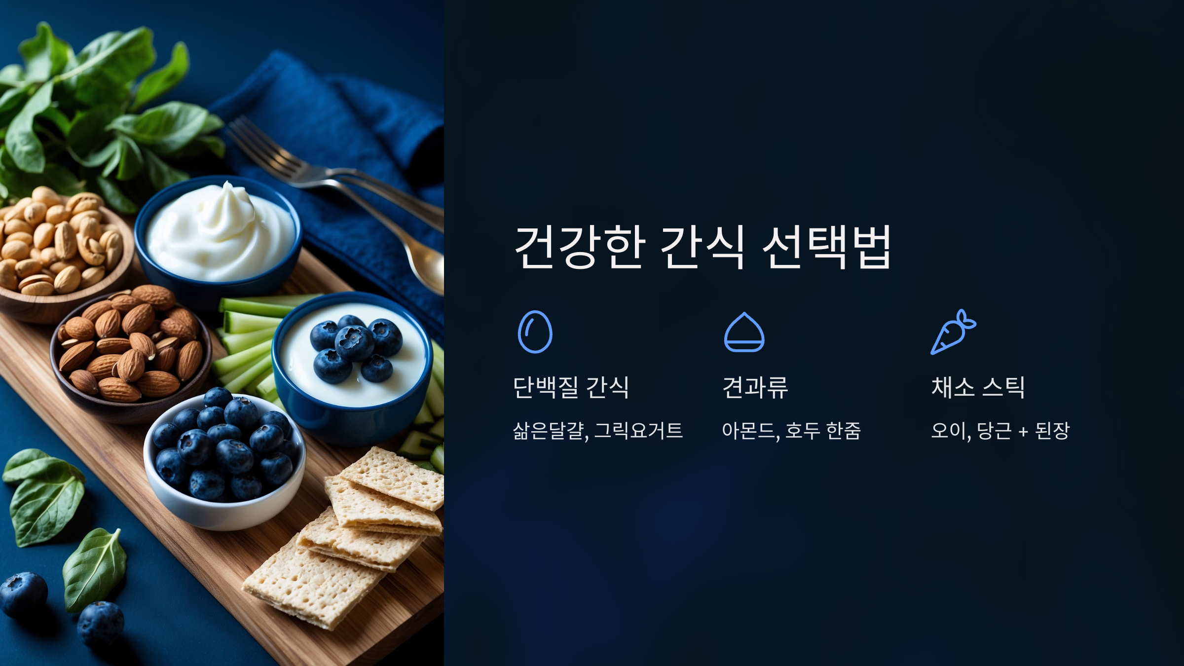 단, 가공식품과 고당 간식은 피하고 자연식 위주로 선택하는 게 좋아요.
