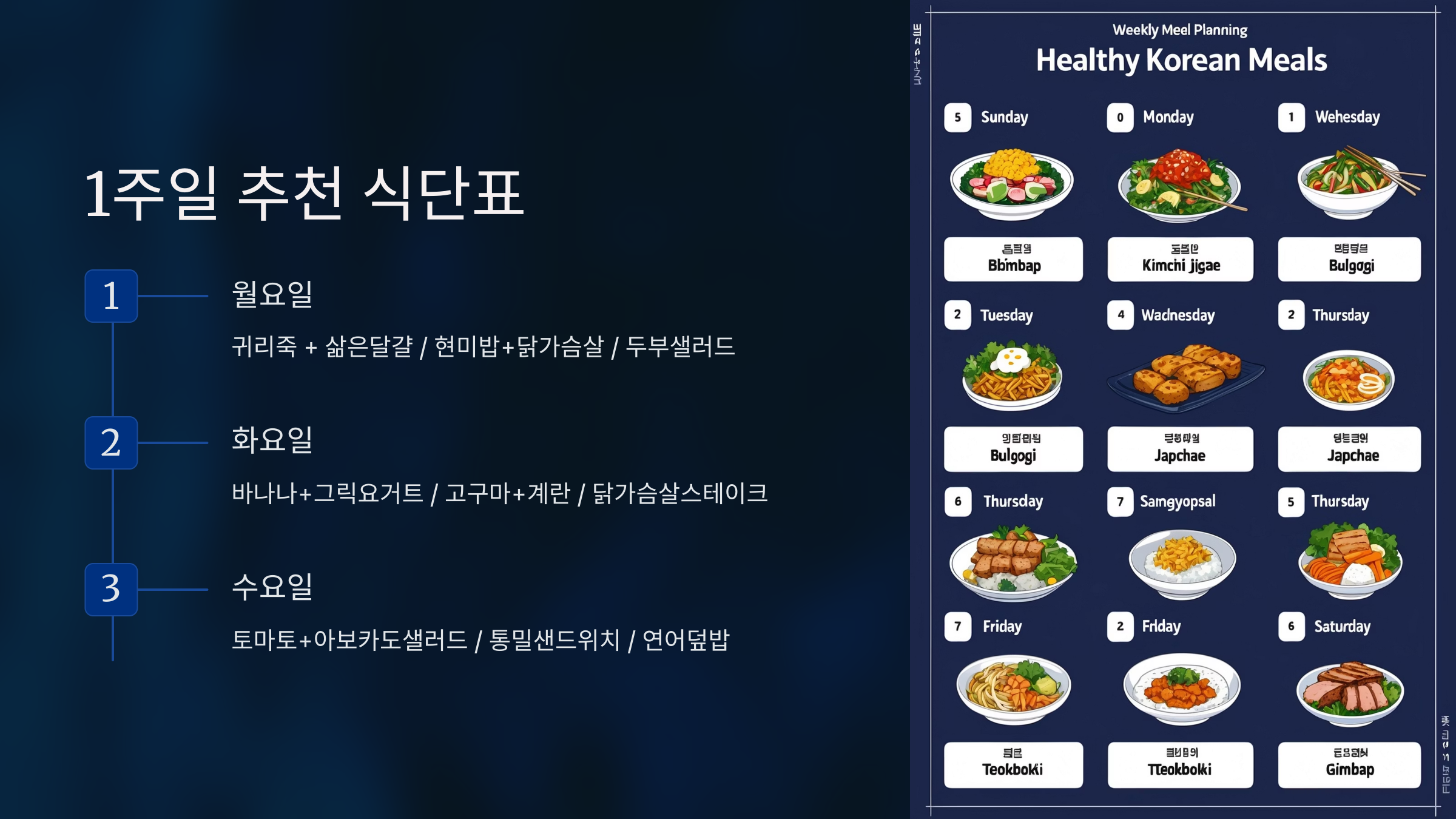 아침/점심/저녁 식단을 미리 정리해두면 심리적 스트레스도 확 줄어요.
