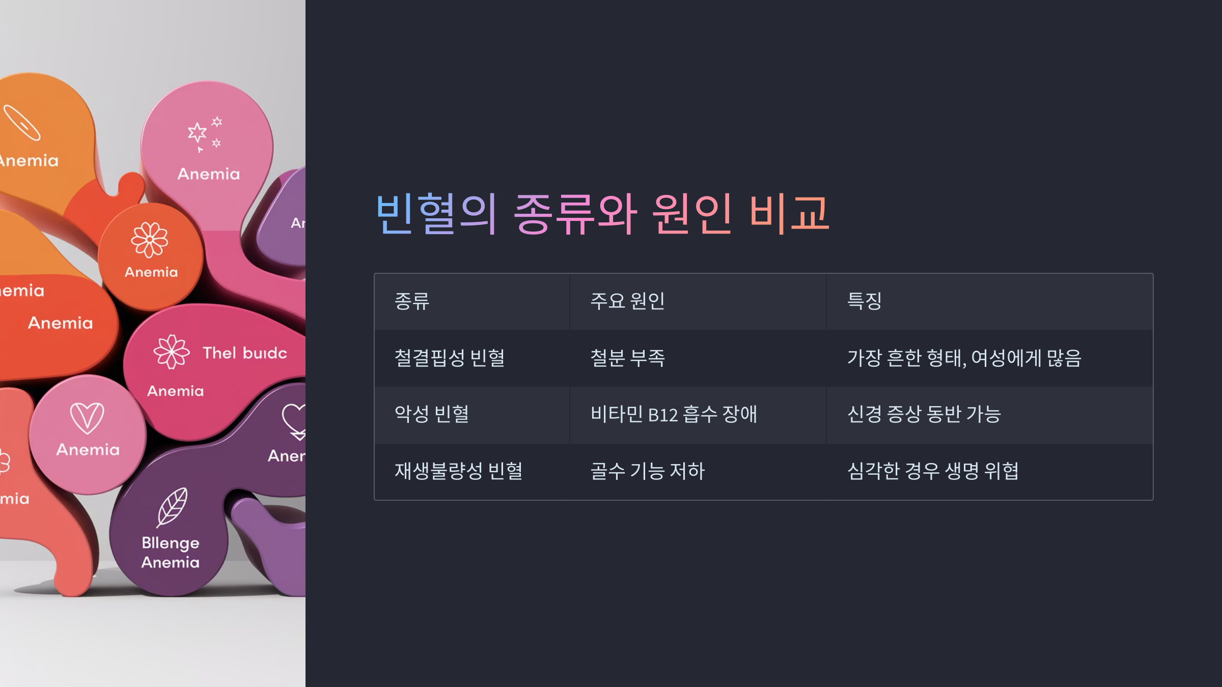 | 철결핍성 빈혈 | 철분 부족 | 가장 흔한 형태, 여성에게 많음 |