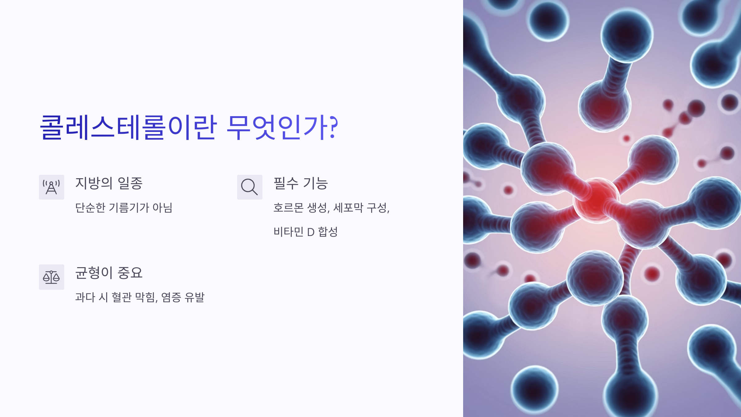 콜레스테롤, 겉만 보면 무섭지만 알고 나면 우리 몸에 꼭 필요한 존재랍니다.