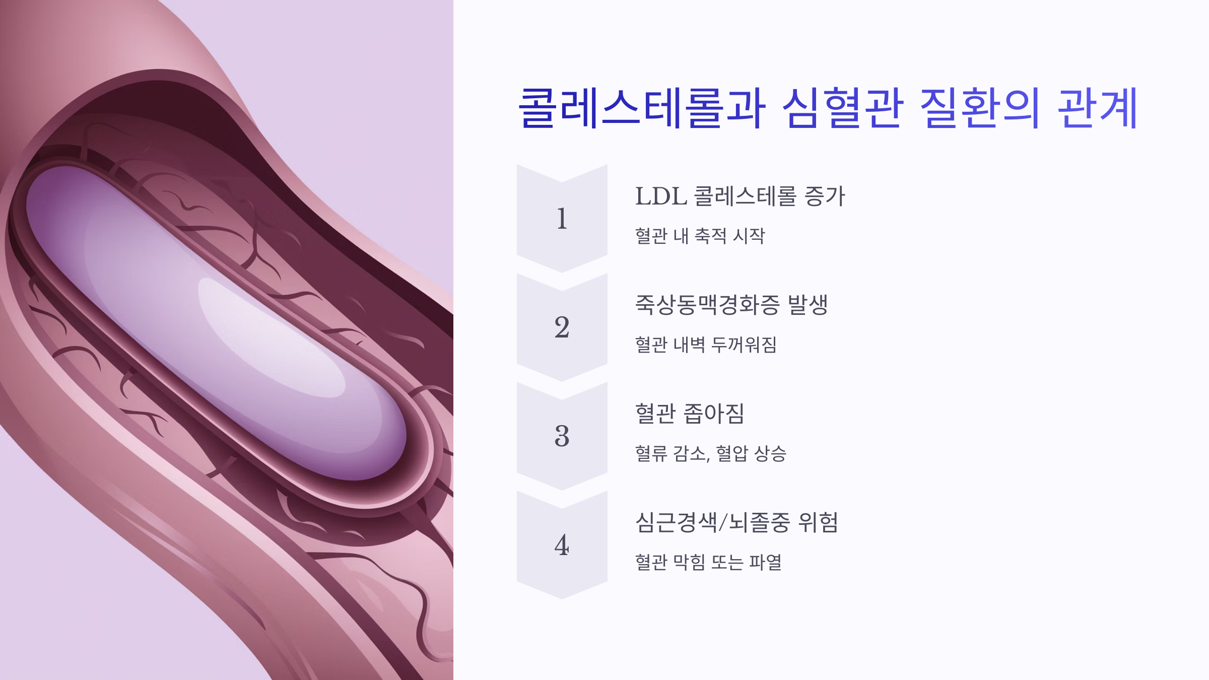 혈관 속에 LDL 콜레스테롤이 쌓이면 죽상동맥경화증이 생기고, 이게 심근경색이나 뇌졸중으로 이어질 수 있죠.
