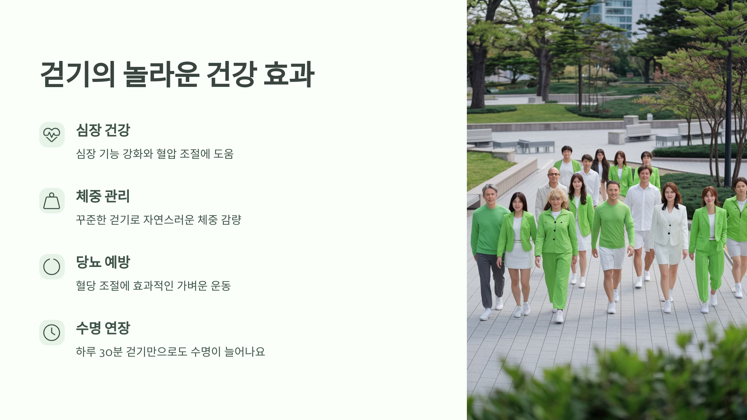 ‘걷기만으로 건강이 좋아질까?’ 싶으시죠? 그런데 걷기는 심장 건강, 혈압 조절, 체중 관리, 당뇨 예방 등