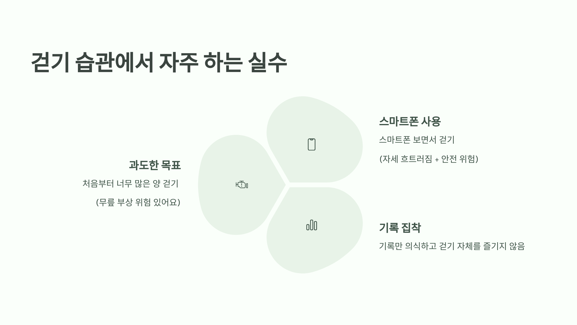 처음엔 의욕 넘치다가도, 몇 가지 실수 때문에 걷기를 포기하게 되는 경우가 많아요. 아래 항목들 체크해보세요.