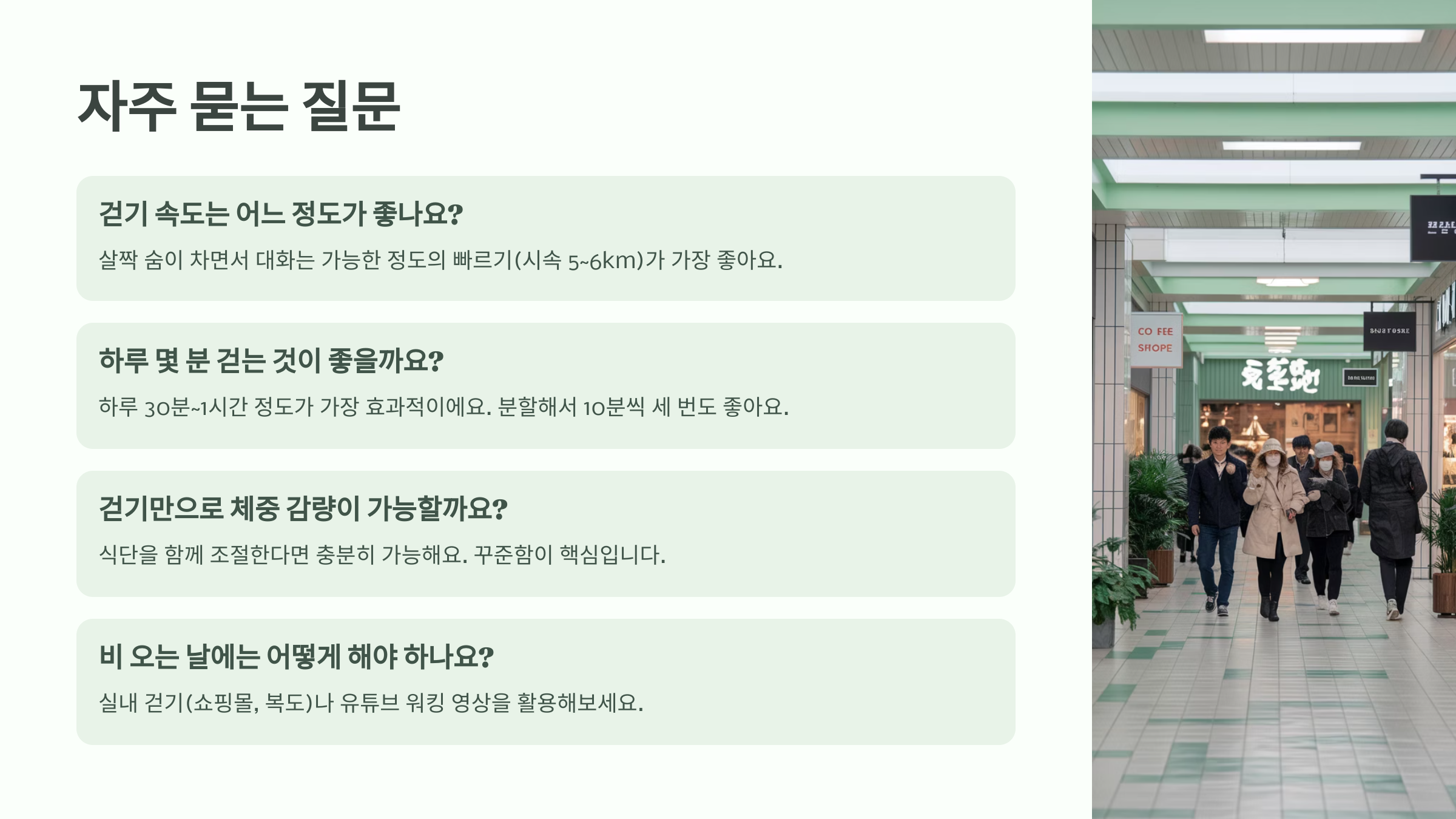 실내 걷기(쇼핑몰, 복도)나 유튜브 워킹 영상을 활용해보세요. 포기하지 않는 게 중요해요!