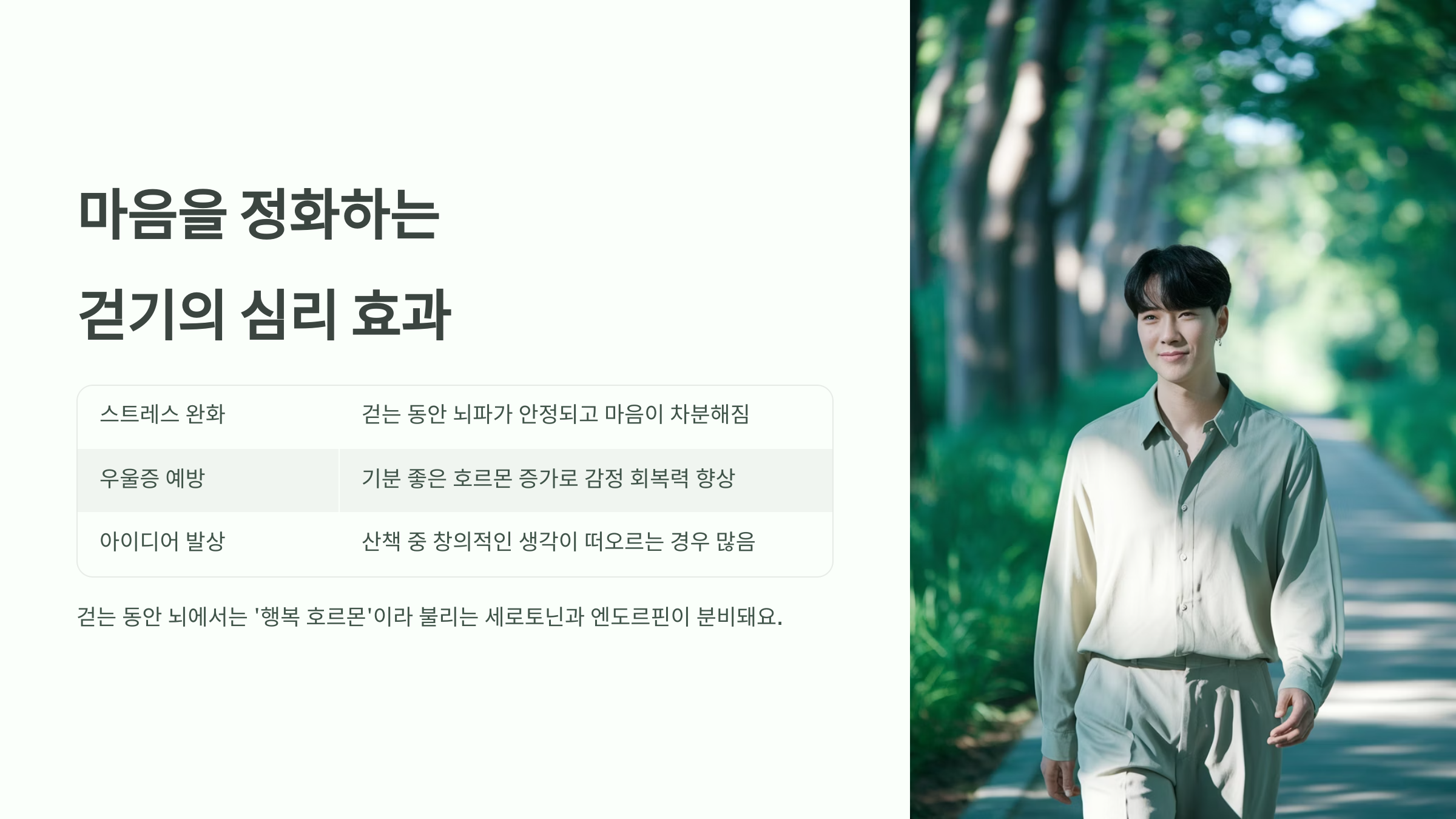 분비되면서 기분이 좋아지고, 우울감과 불안이 완화돼요. 특히 자연 속을 걷는다면 그 효과는 배가되죠.