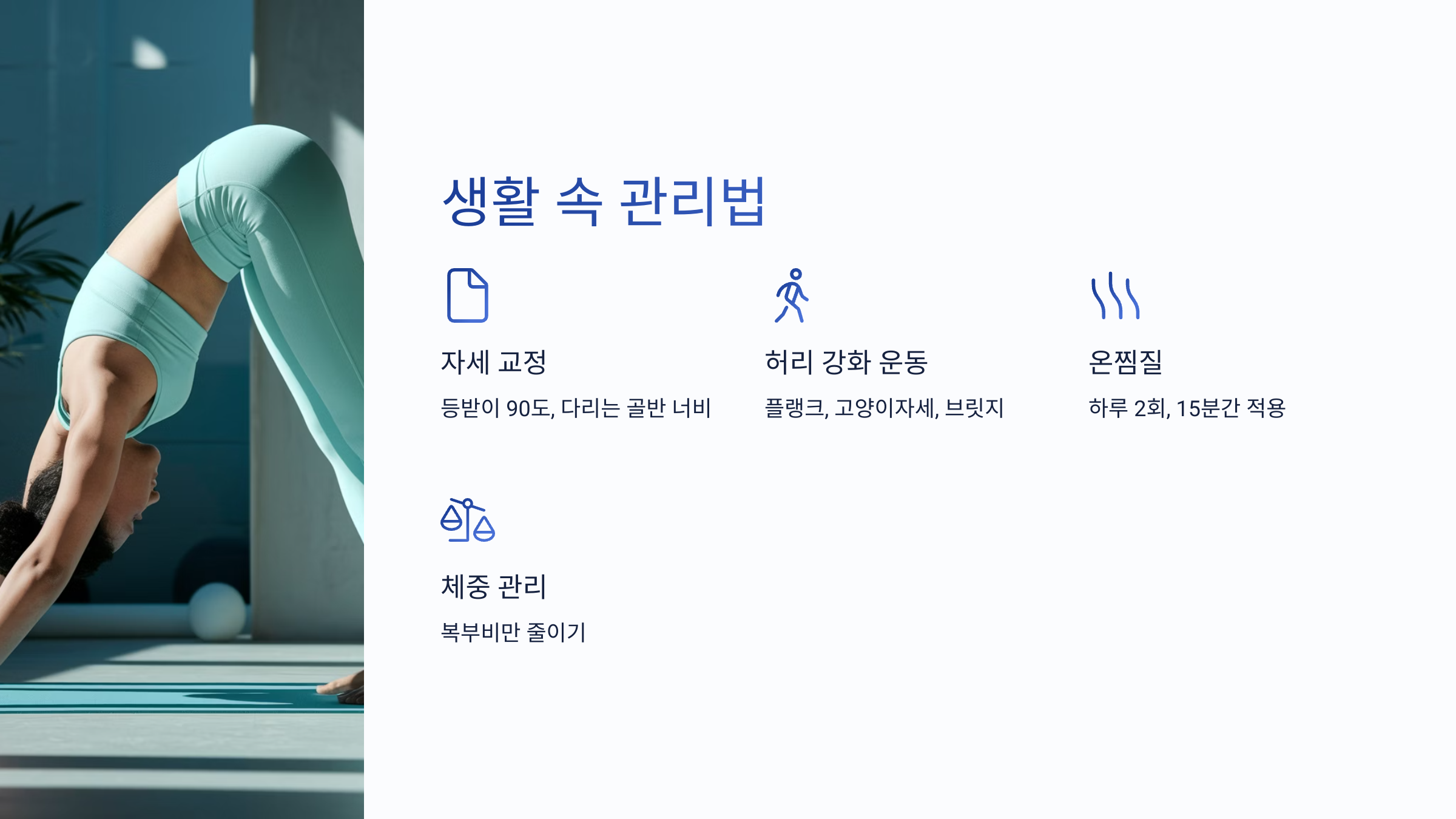 | 체중 관리 | 복부비만이 디스크 압박을 유발함 |