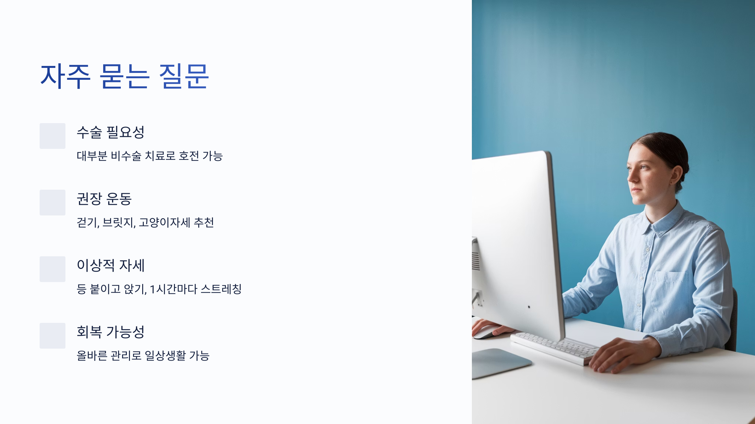 조기에 관리하고 생활습관을 조금씩 바꿔나간다면 수술 없이도 충분히 극복할 수 있습니다.