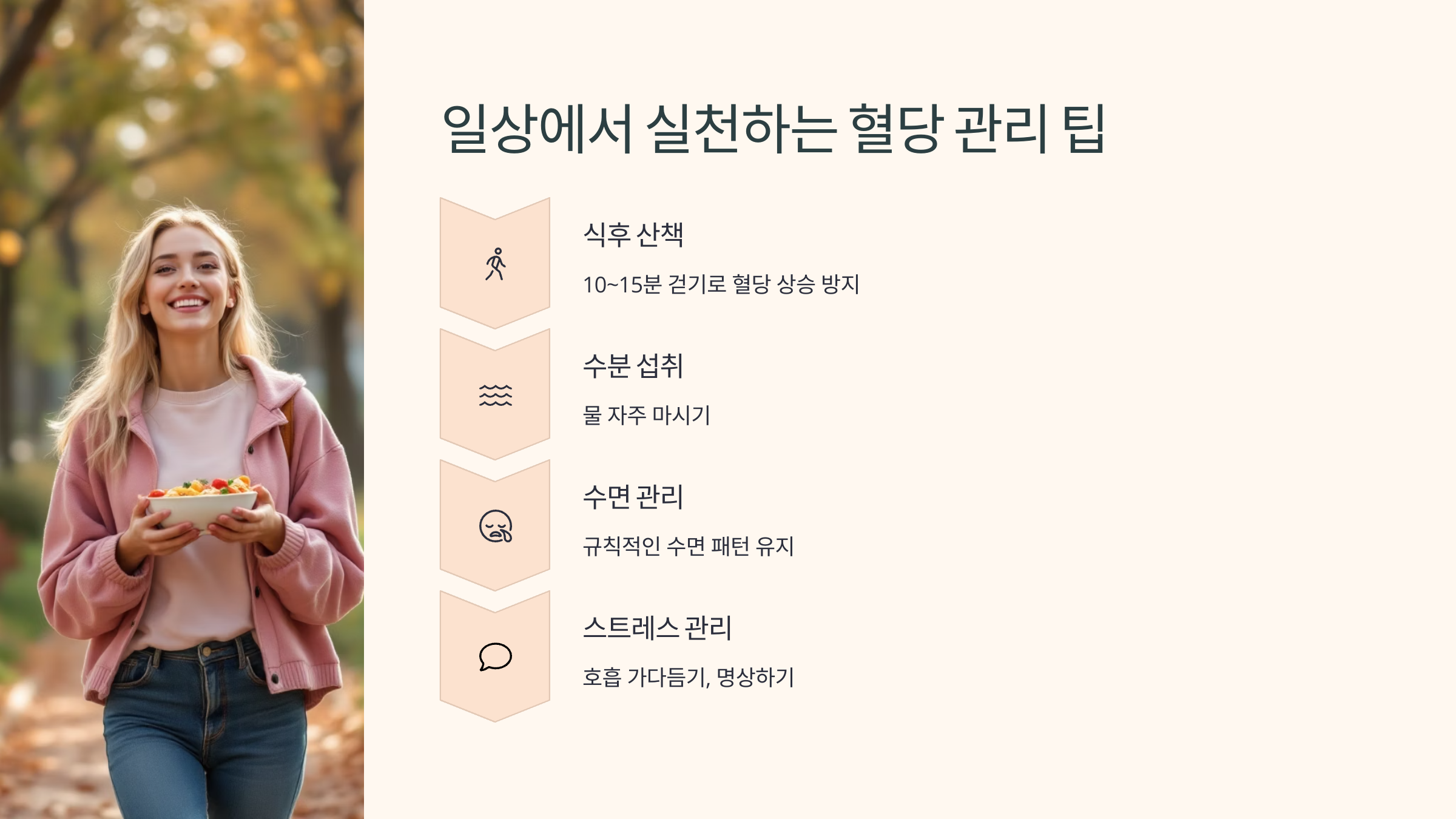 가장 쉬운 건 식사 직후 산책이에요. 10~15분만 걸어도 혈당 상승을 막는 데 큰 도움이 되죠.