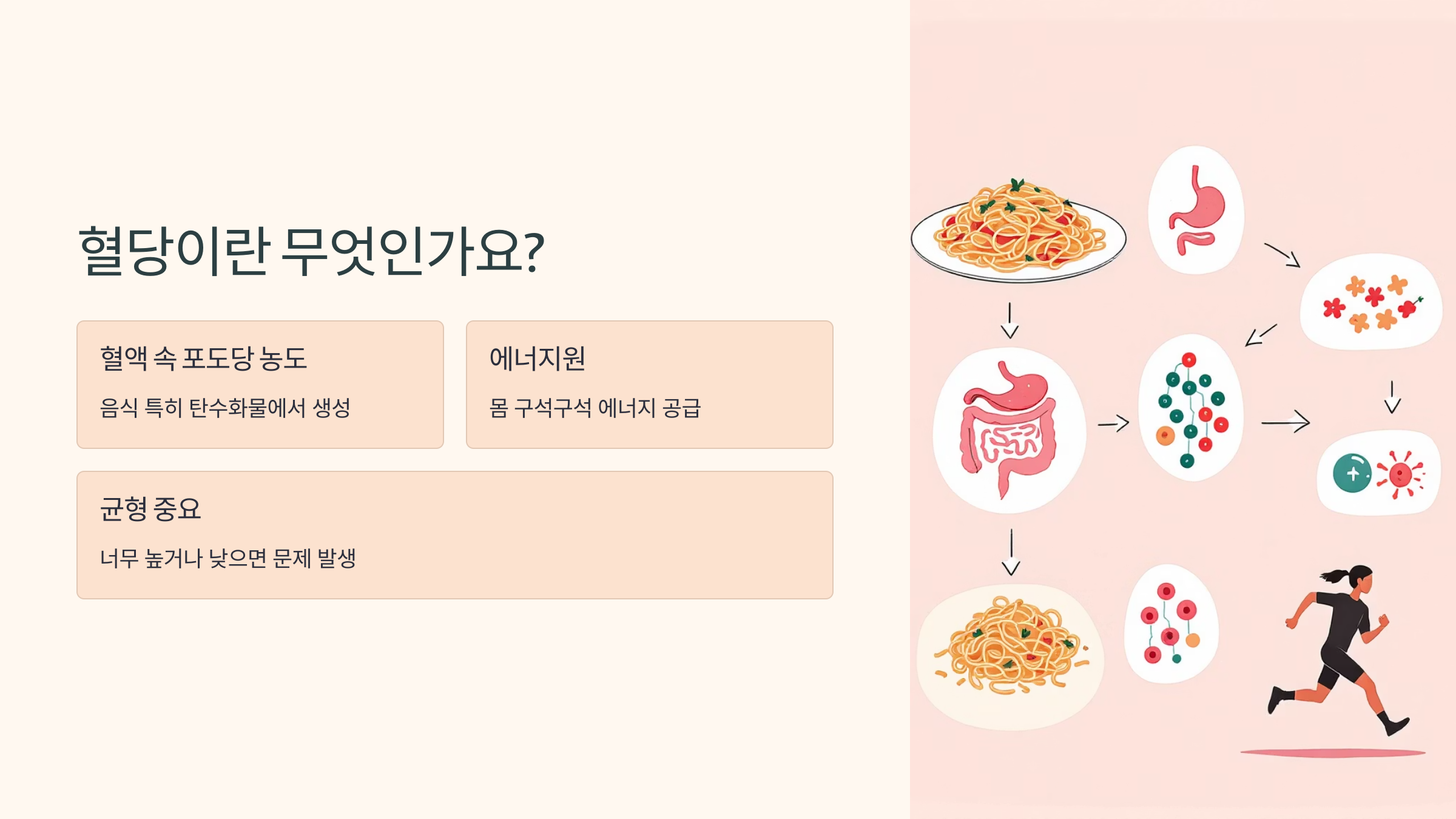 근데 이게 너무 많거나 적으면 문제가 생겨요.혈당이 높으면 당뇨로 이어질 수 있고, 너무 낮아도 어지럽고 집중이 안 되고요.