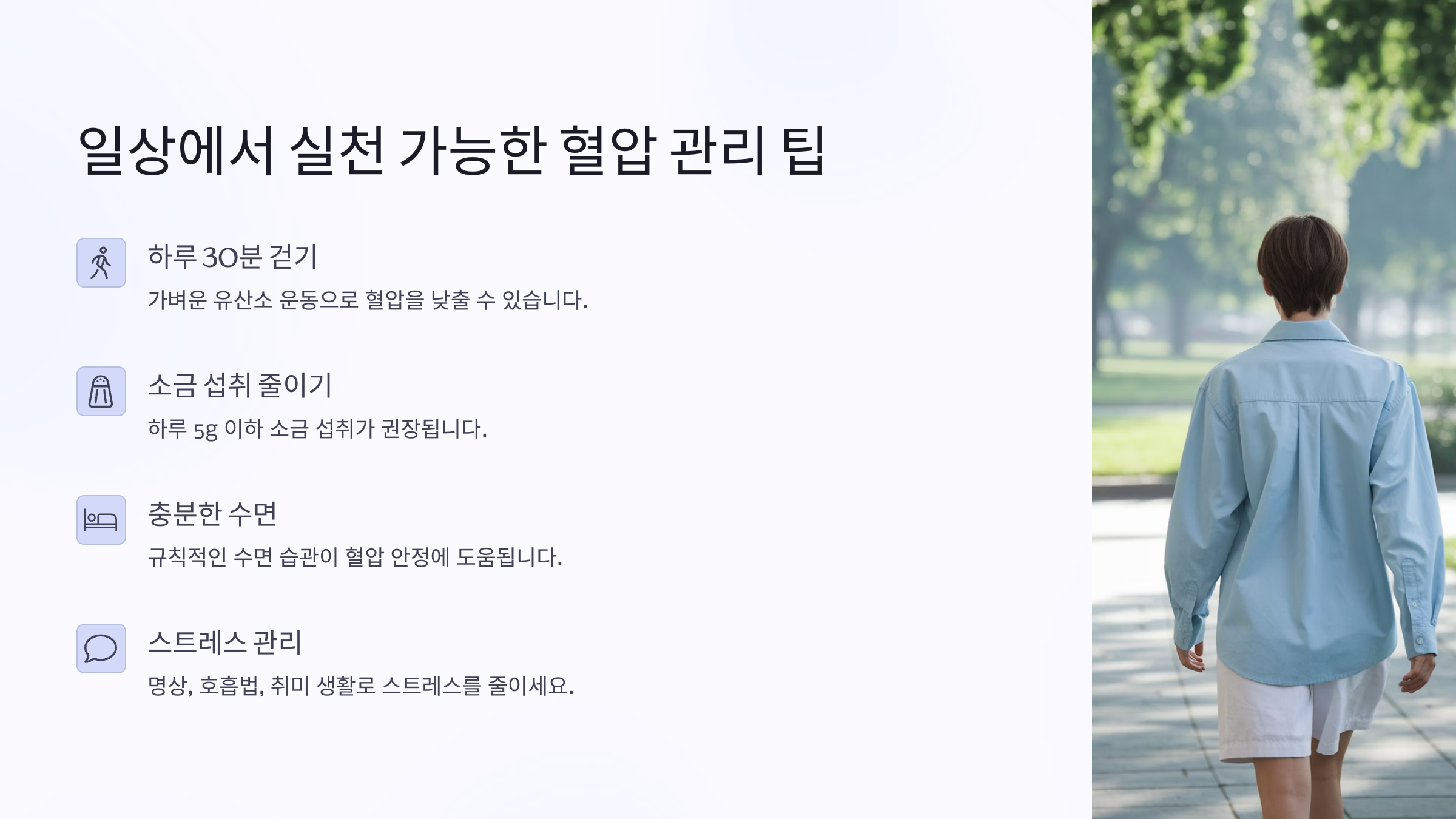 - 소금 섭취 줄이기 (하루 5g 이하 권장)