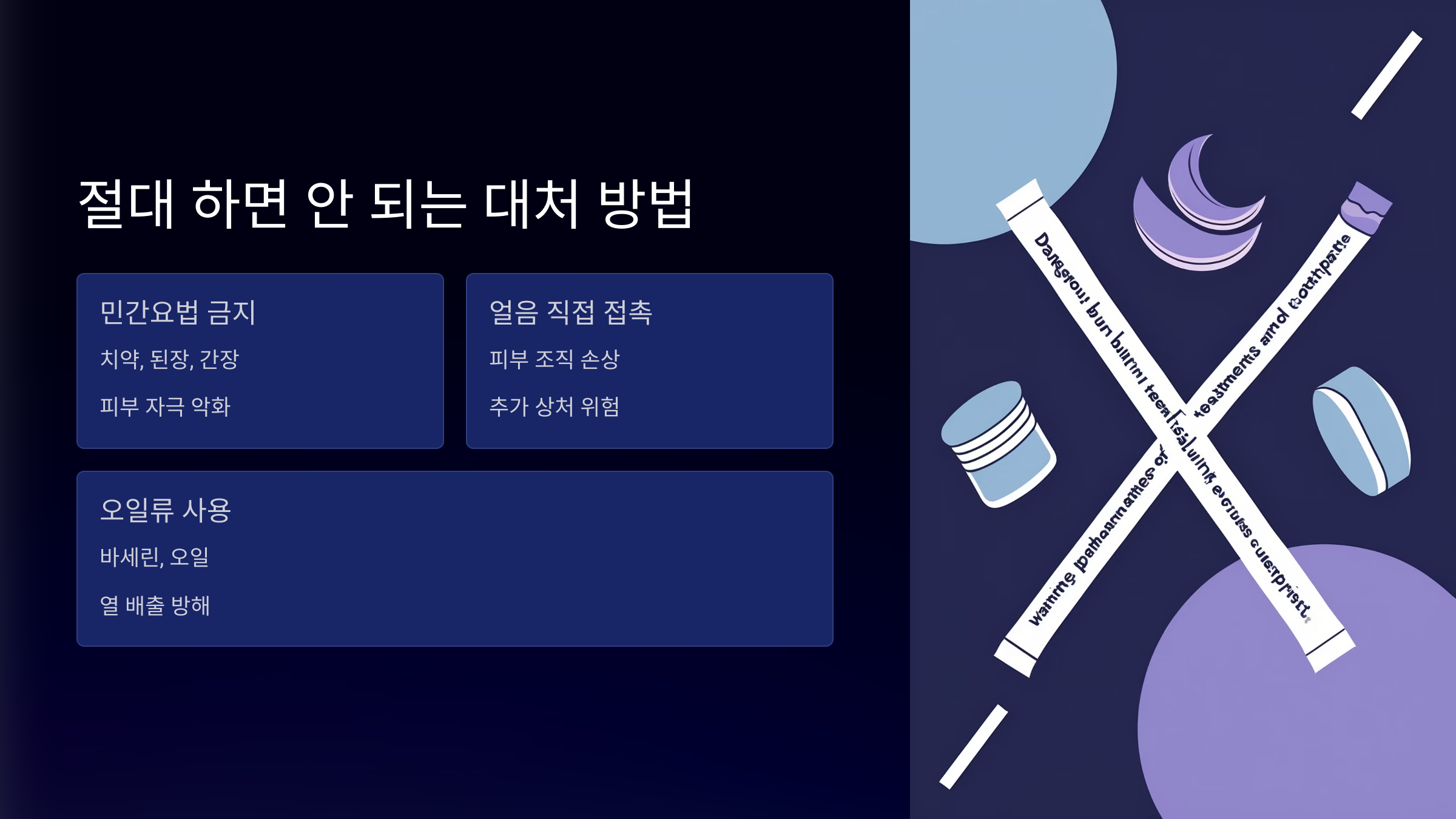 • 치약/된장/간장 등은 피부에 자극을 줘 상처를 악화시킵니다