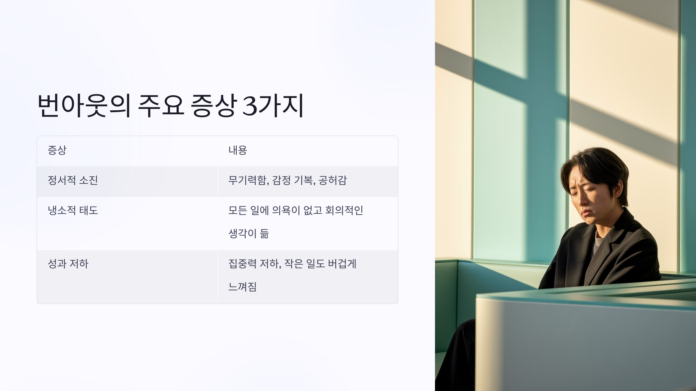 번아웃은 다양한 방식으로 나타나요. 하지만 그중에서도 세 가지 대표적인 증상은 꼭 기억해두세요. 아래 표로 정리해봤어요.