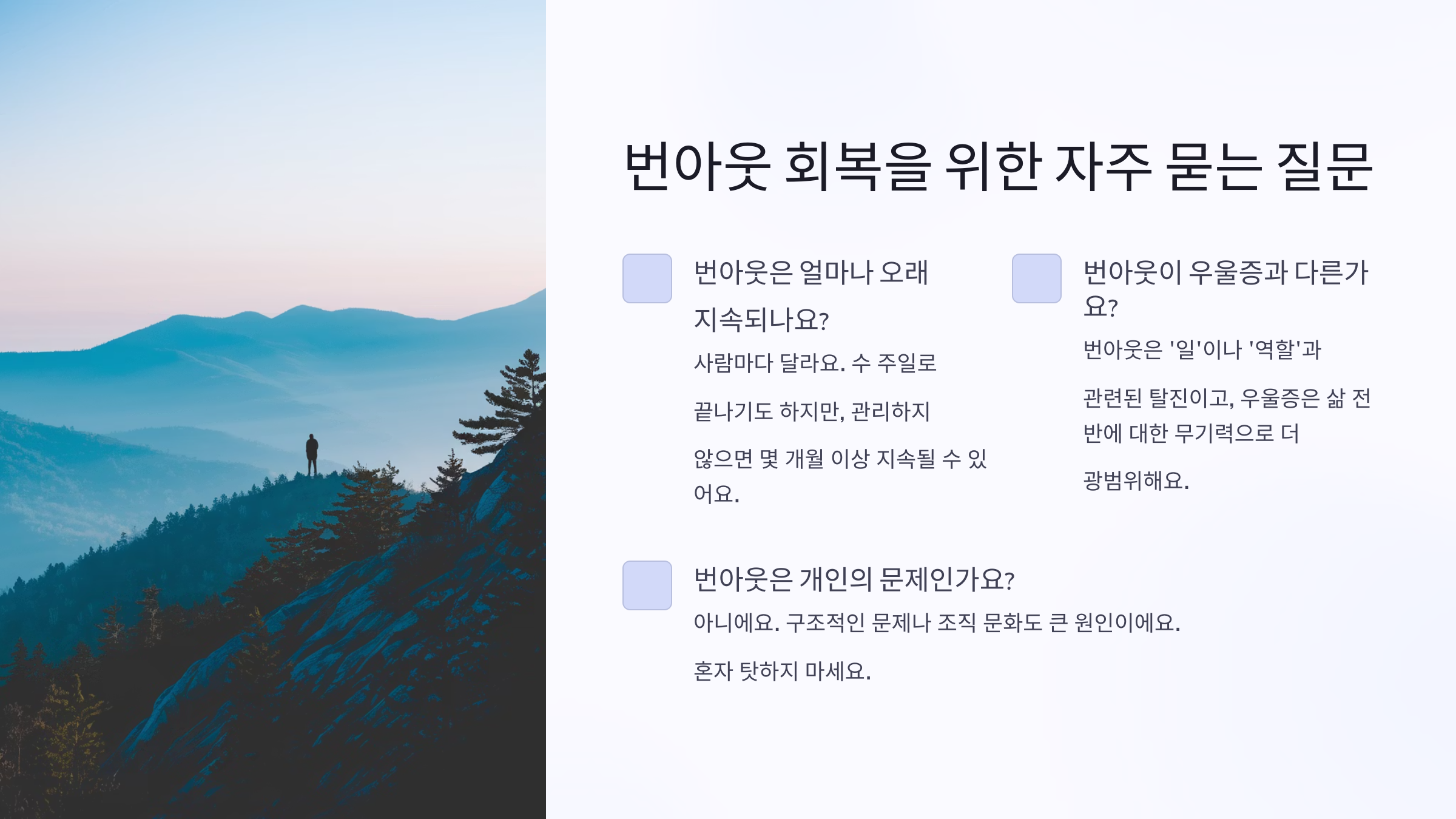 - 번아웃은 게으름이다 → ❌ 너무 열심히 한 결과예요