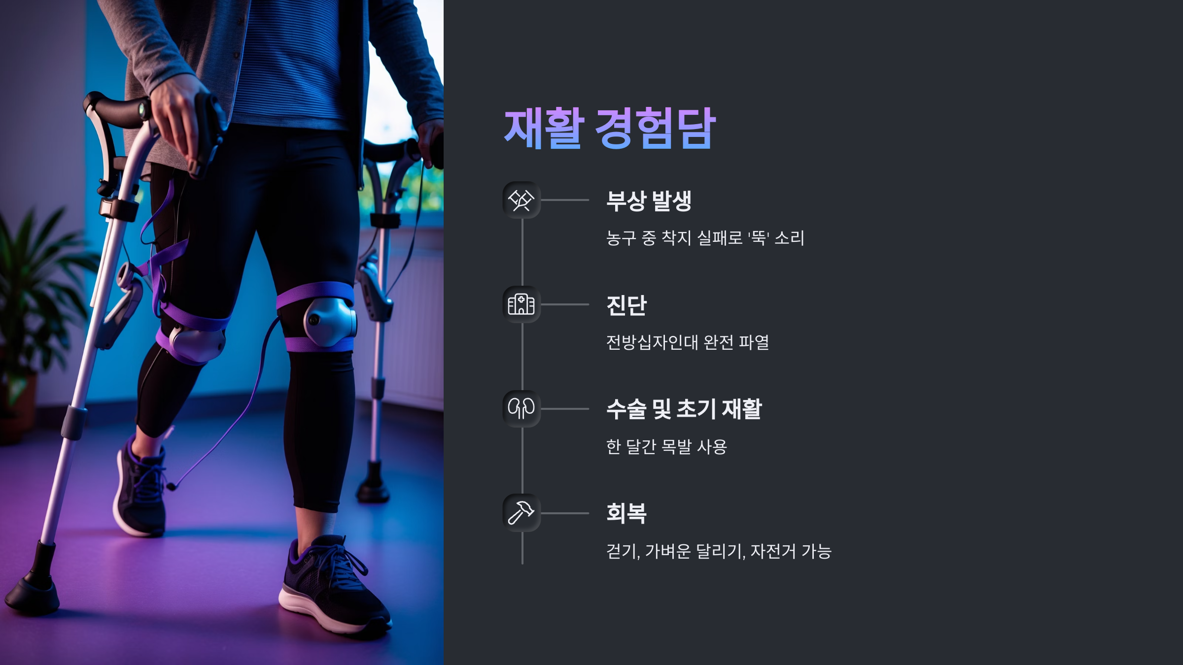 수술 후 한 달간은 목발 짚고 다녔고, 재활은 정말 인내와 싸움이더군요.