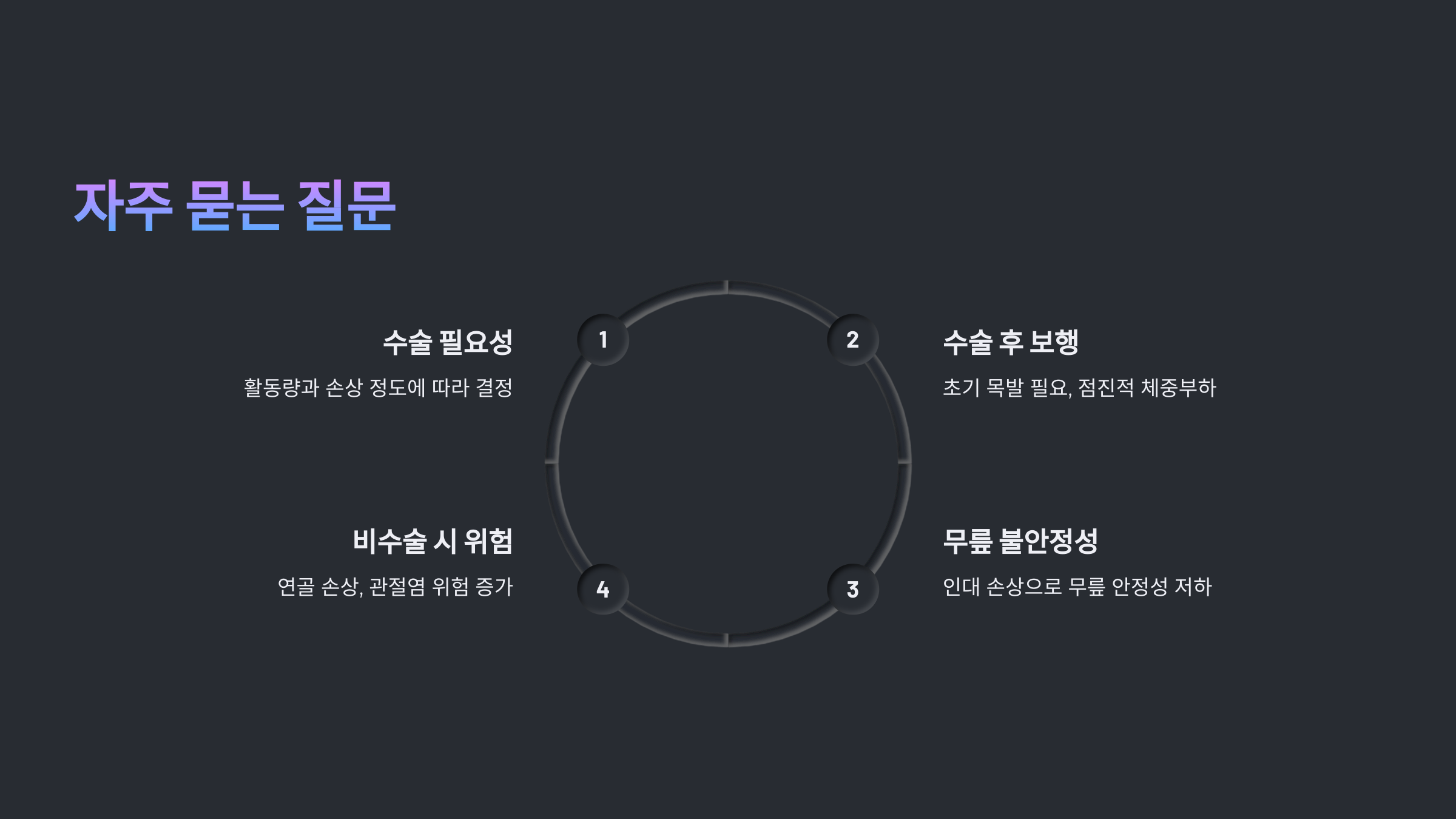운동선수나 반복적 무릎 불안정성이 있다면 수술이 권장됩니다.