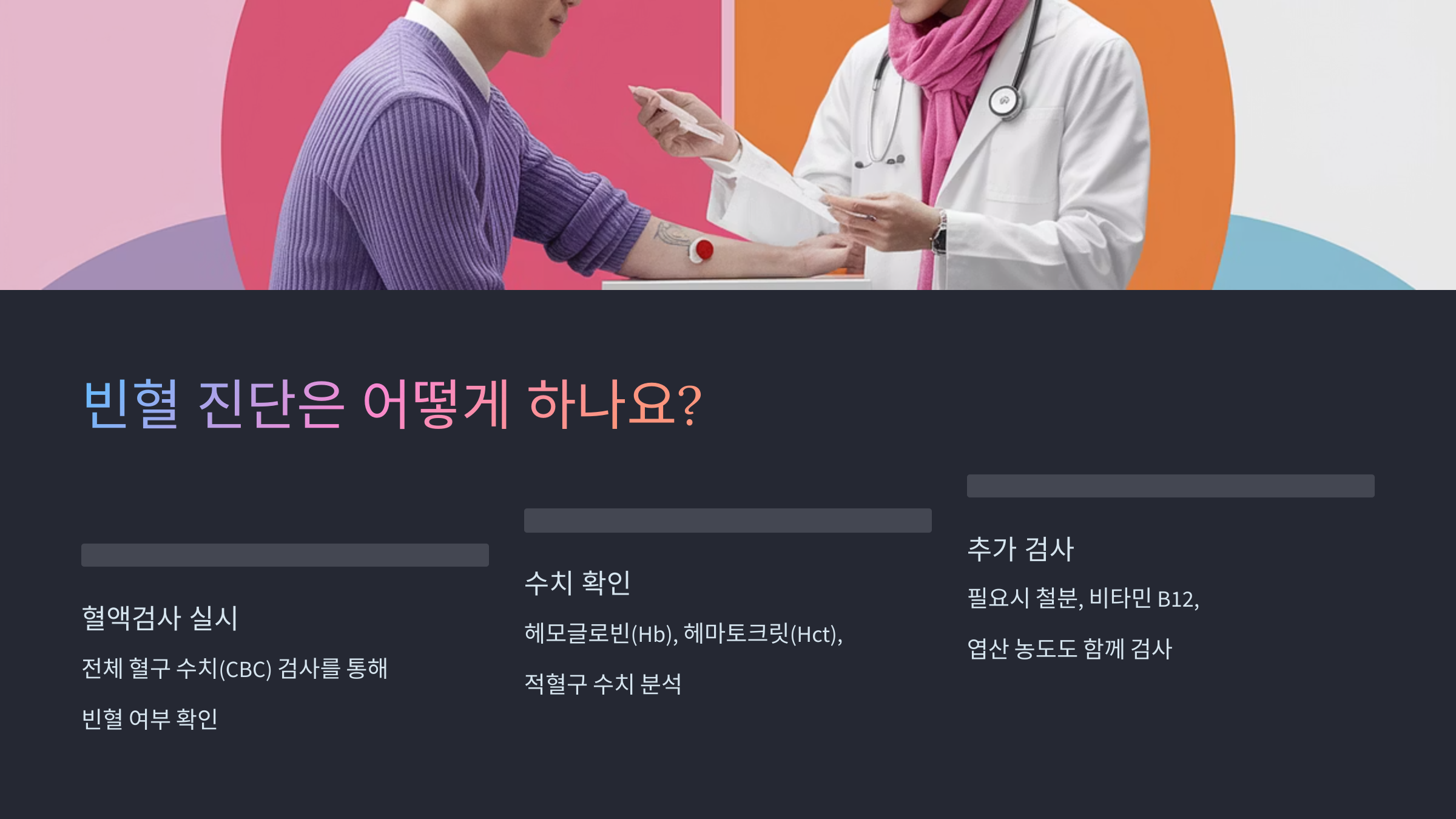 빈혈이 의심된다면 가장 먼저 해야 할 일은 혈액검사예요.