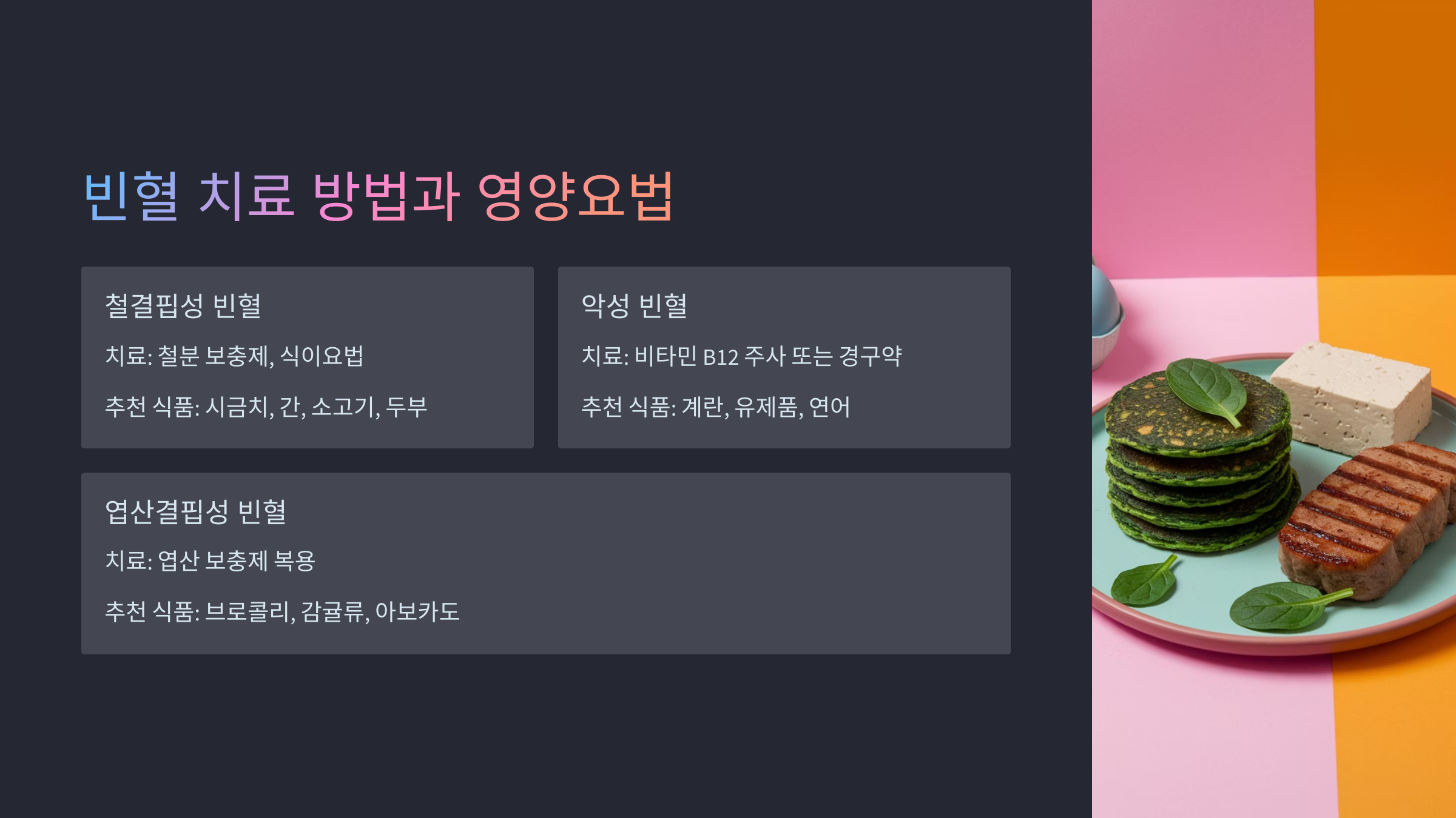 아래 표는 빈혈 유형별 치료 방식과 추천 식품을 정리한 거예요.