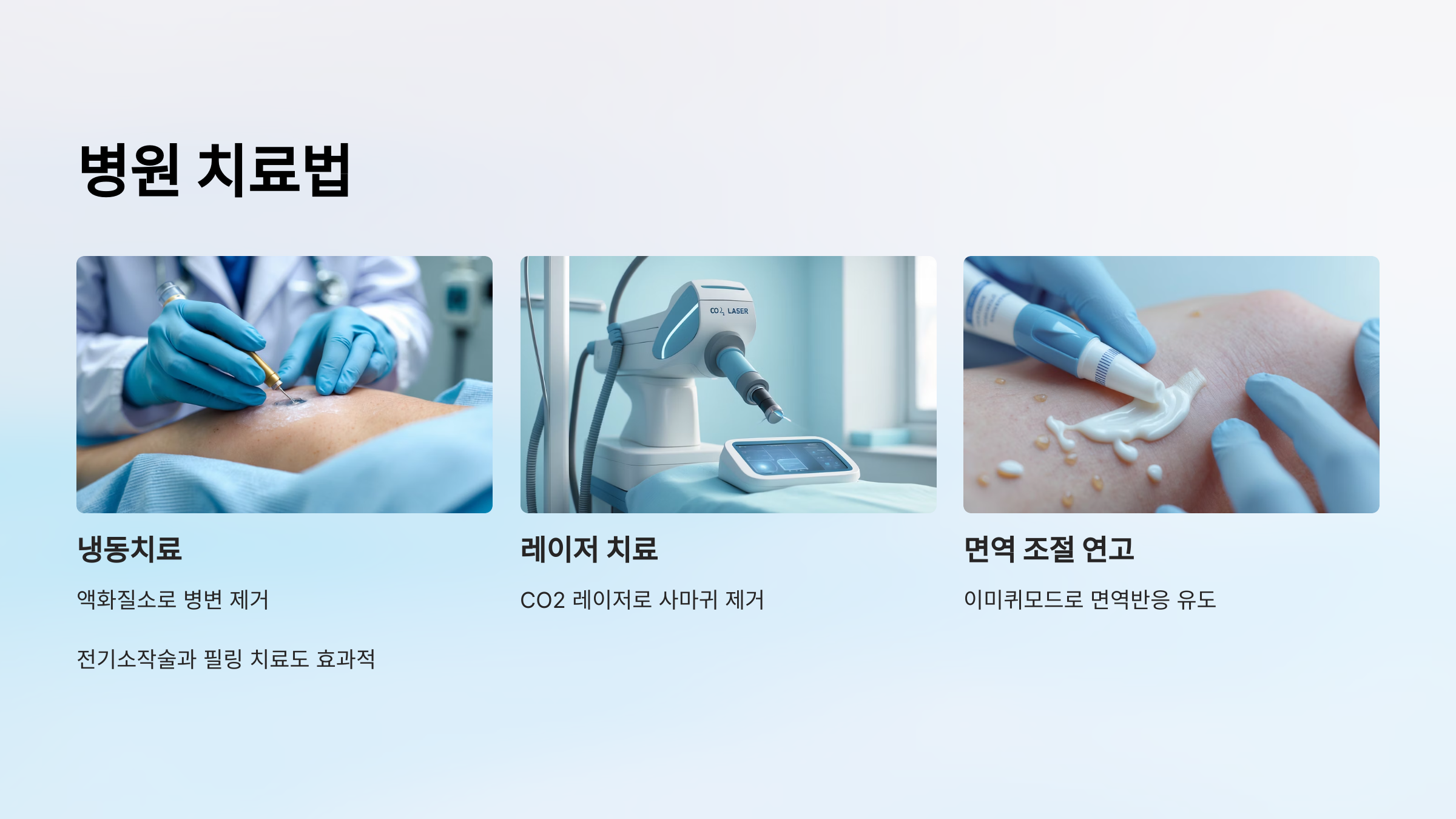 - 냉동치료(크라이오테라피) – 액화질소를 이용하여 병변을 얼려 제거합니다.