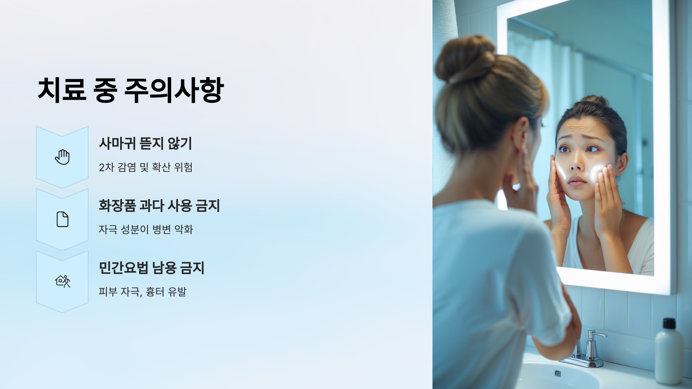 | 화장품 과다 사용 | 자극 성분이 병변을 악화시킬 수 있음 |