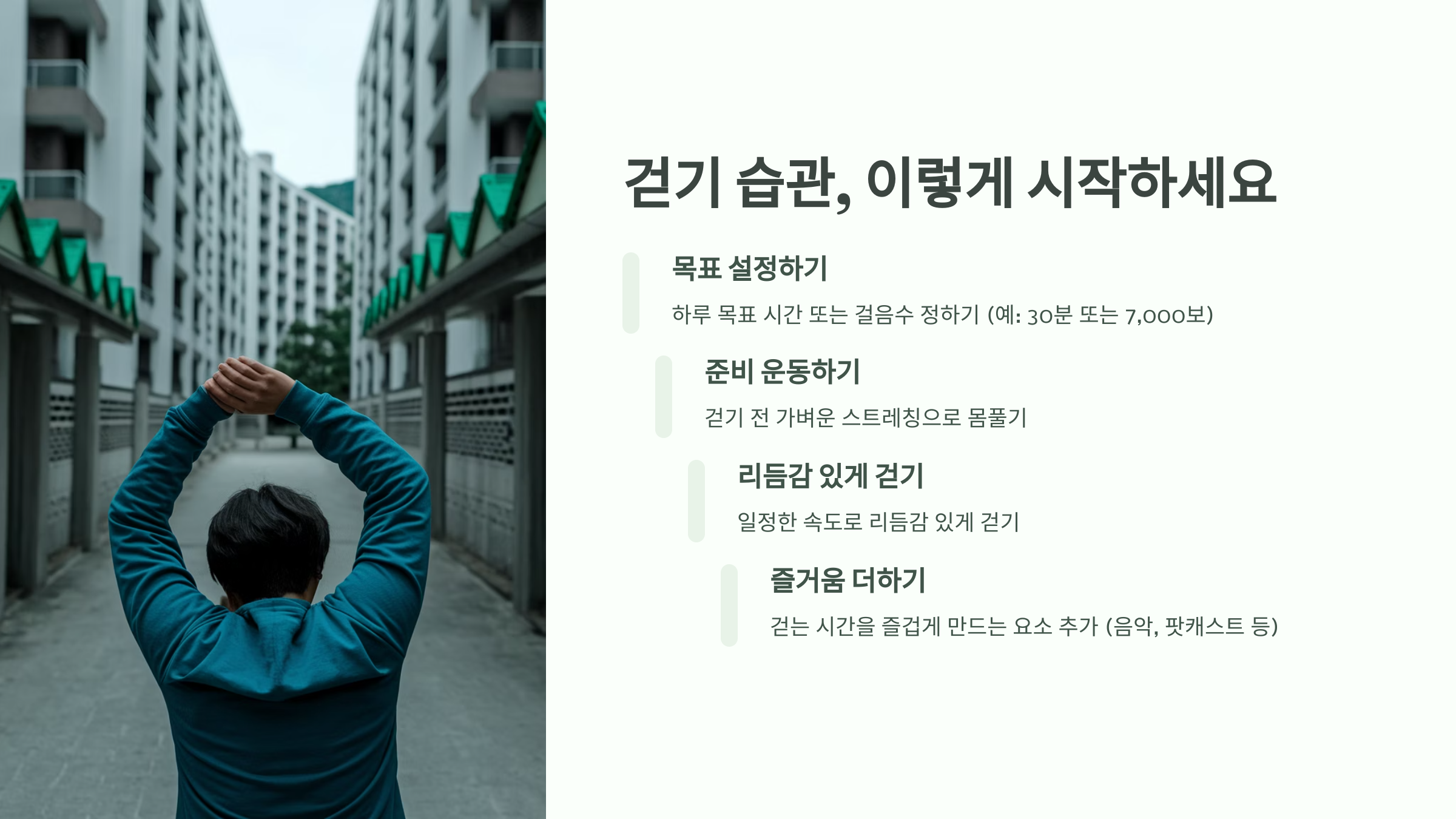 걷기는 시작이 반이에요. 막연하게 ‘걸어야지’보단 구체적으로 계획하고 실천하는 게 중요하죠. 아래 순서를 따라 해보세요.