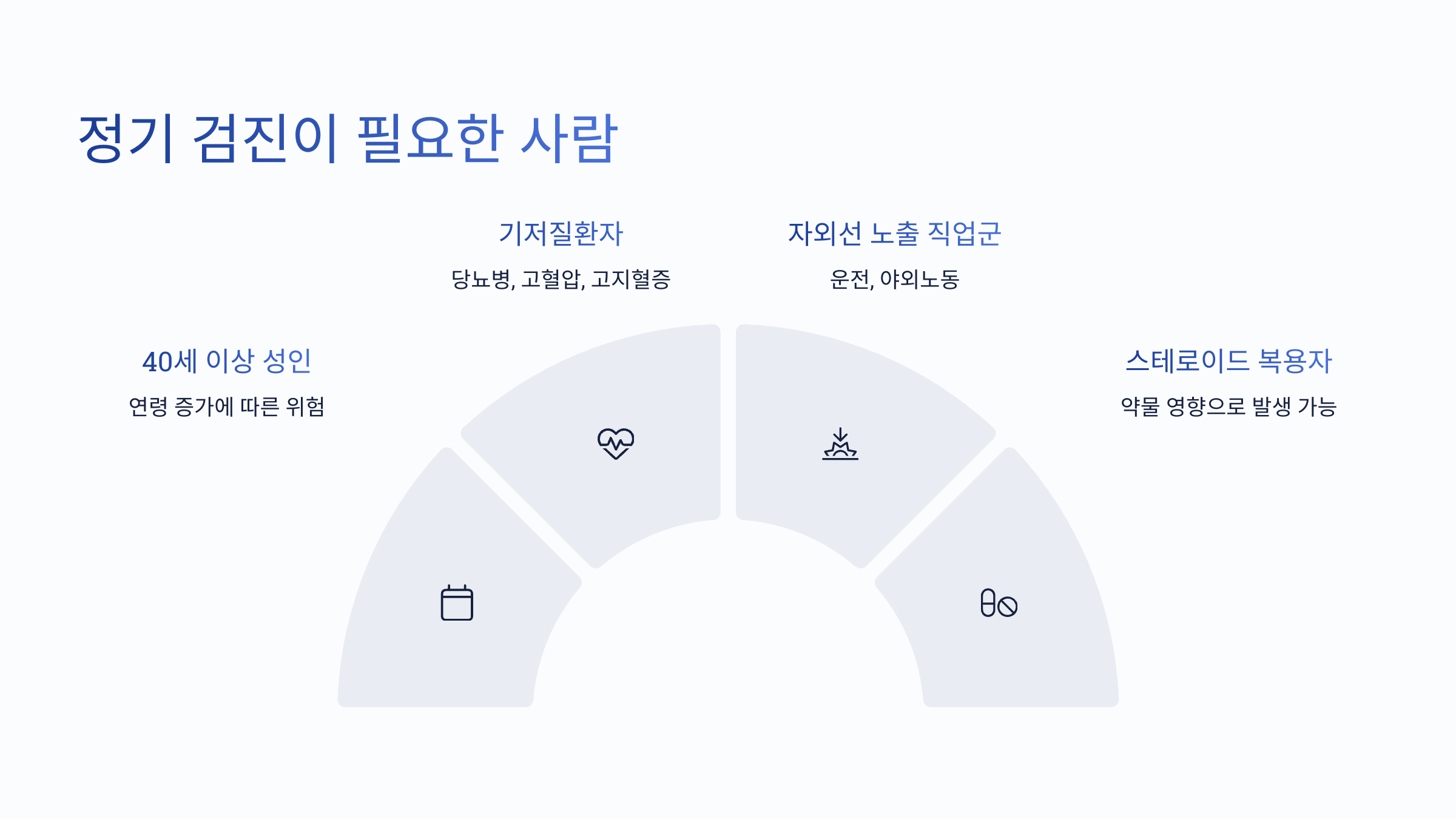 | 초기 관리 | 자외선 차단, 혈당 조절, 항산화 성분 섭취 등으로 진행 억제 |