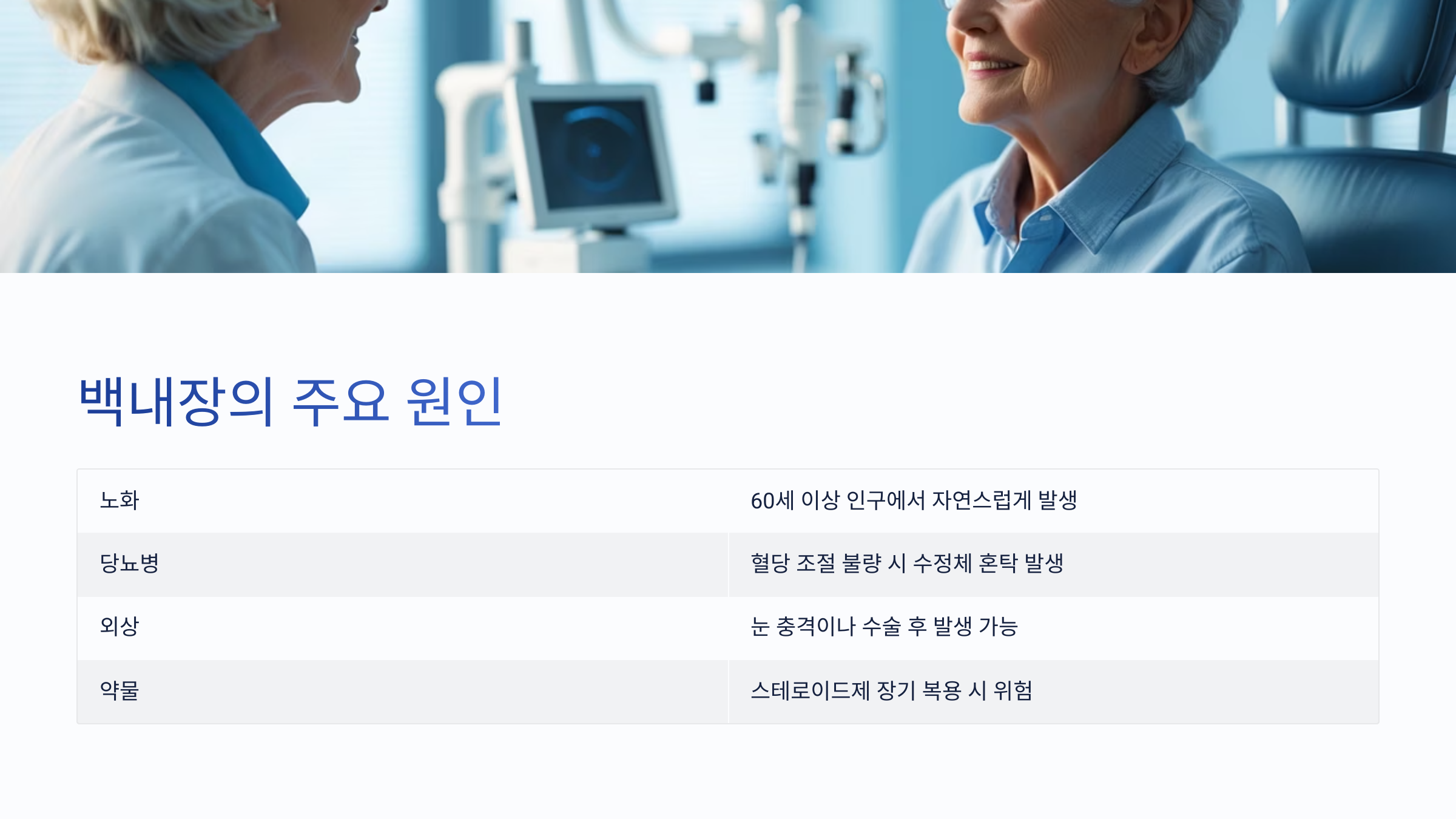 | 노화 | 60세 이상 인구에서 자연스럽게 발생하는 노인성 백내장이 가장 흔함 |